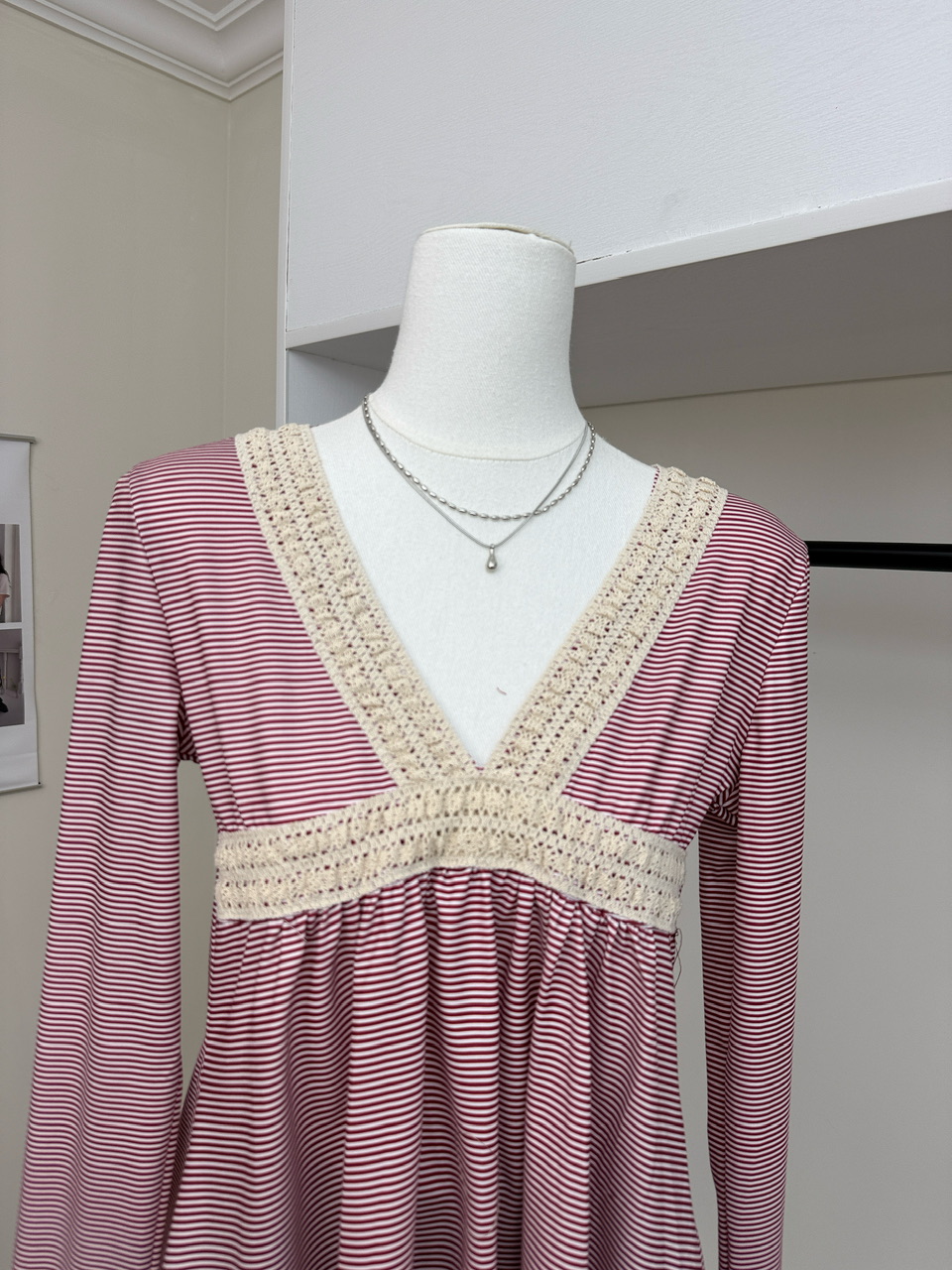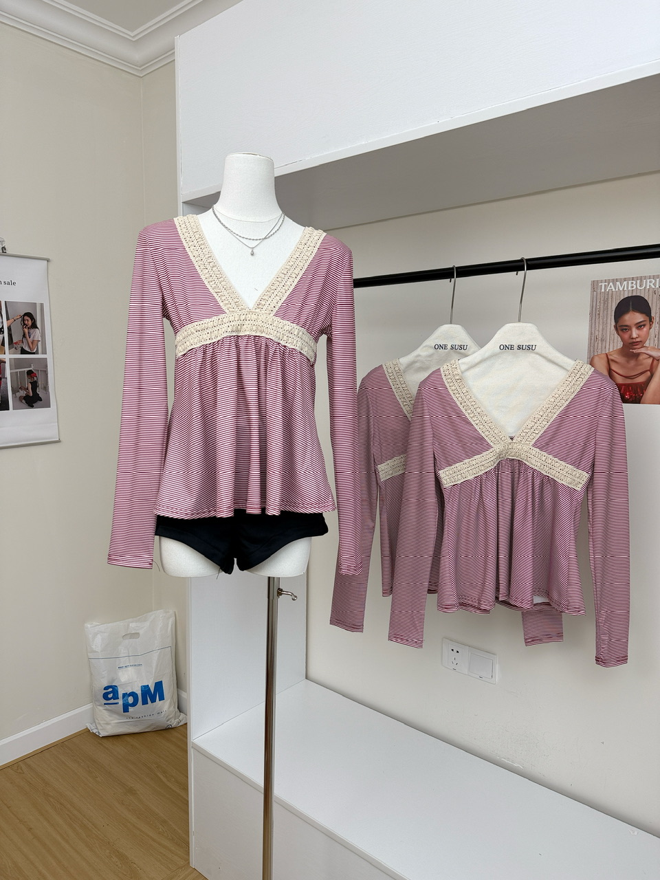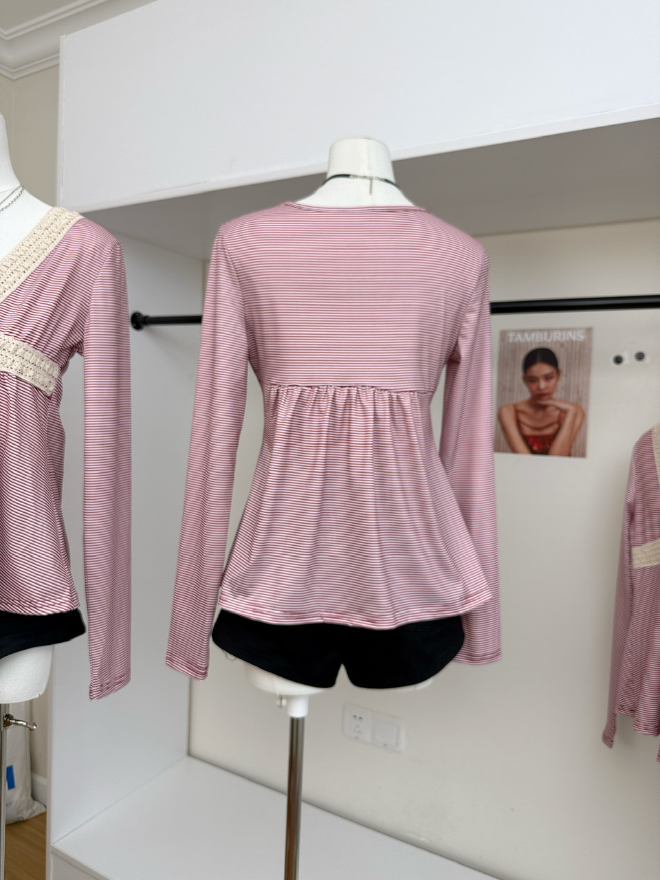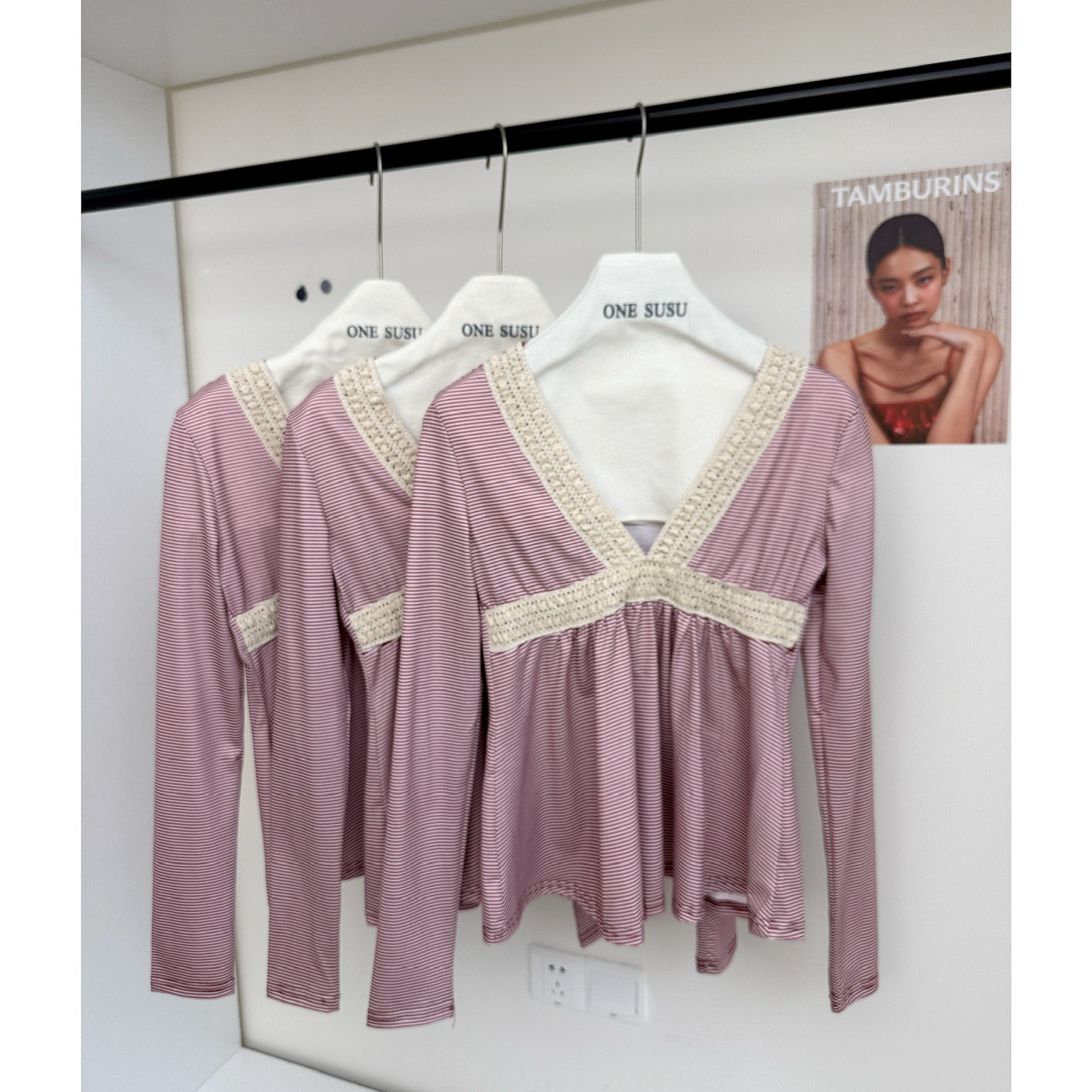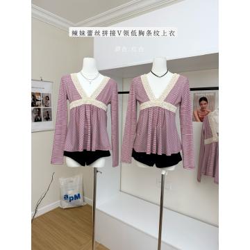 BY10136# 古早感辣妹蕾丝拼接V领低胸条纹长袖T恤高腰A摆显瘦上衣 服裝批發女裝批發服飾貨源