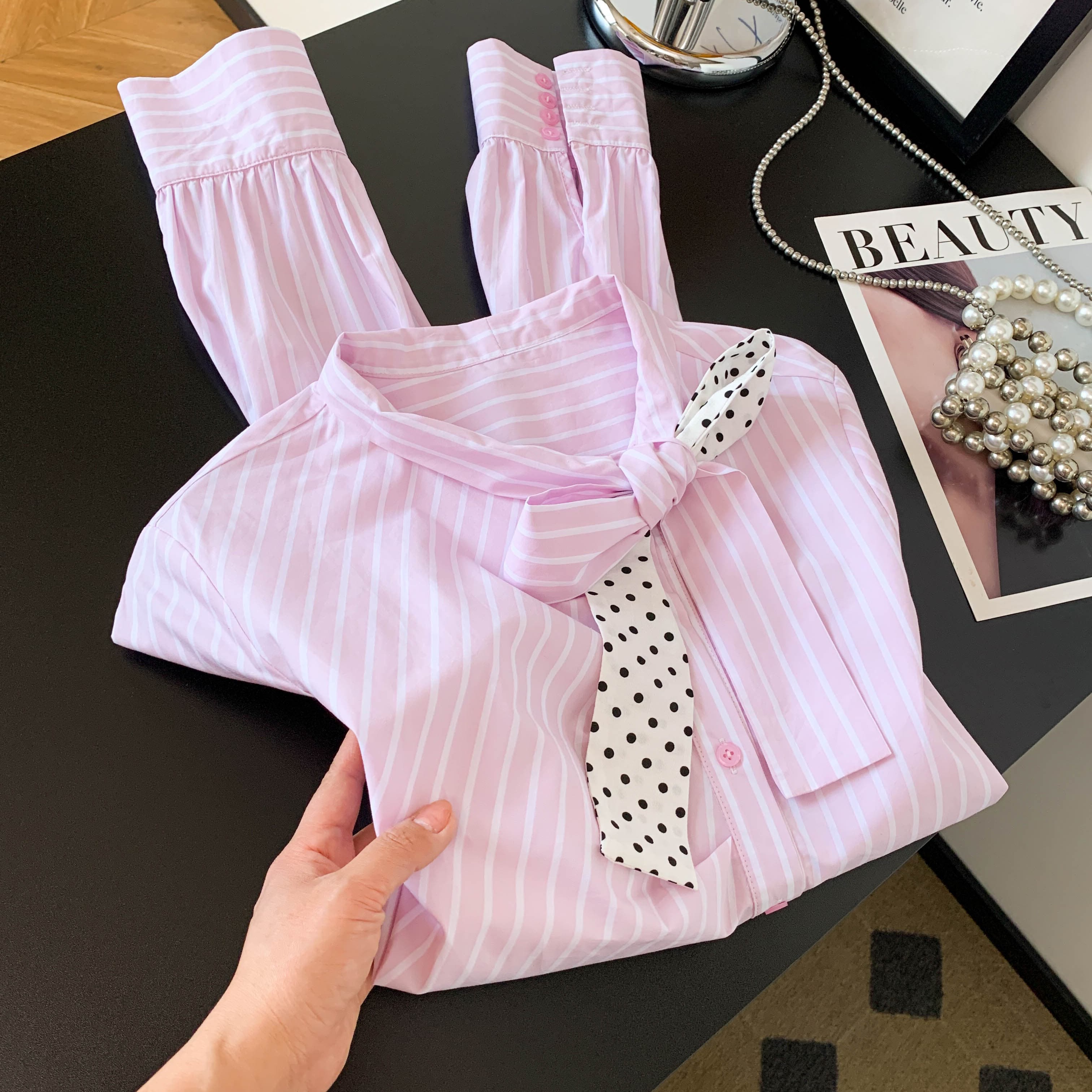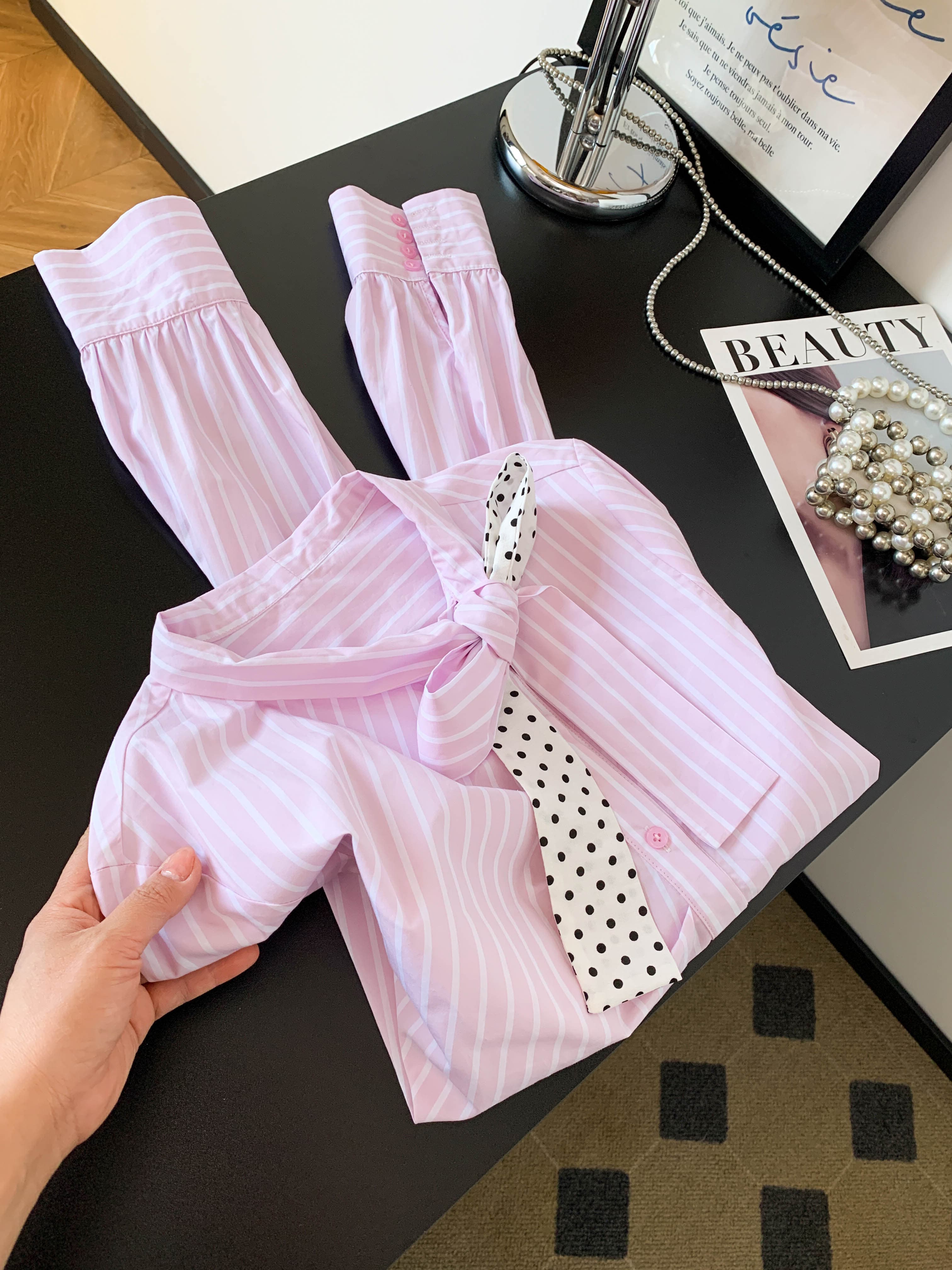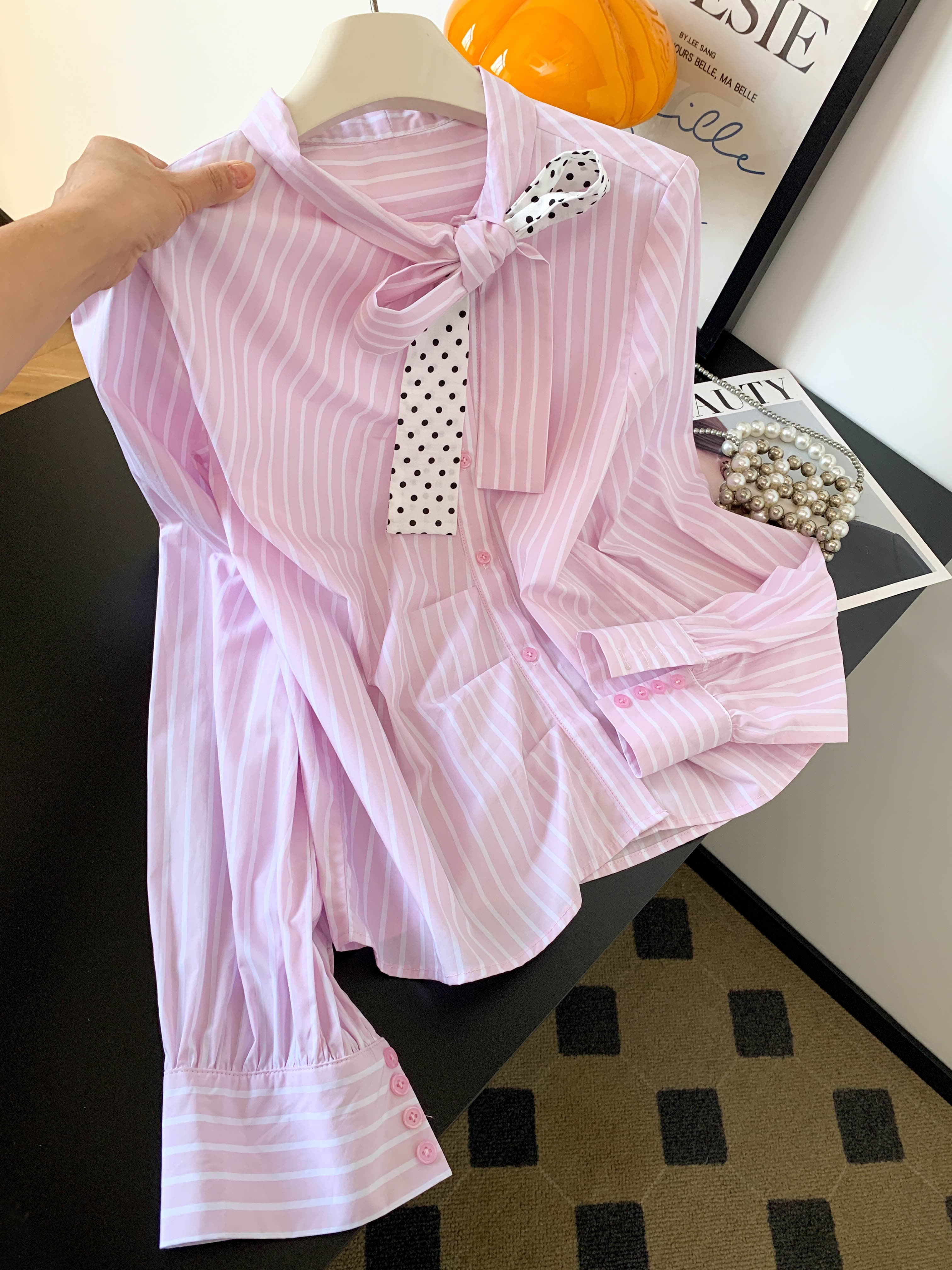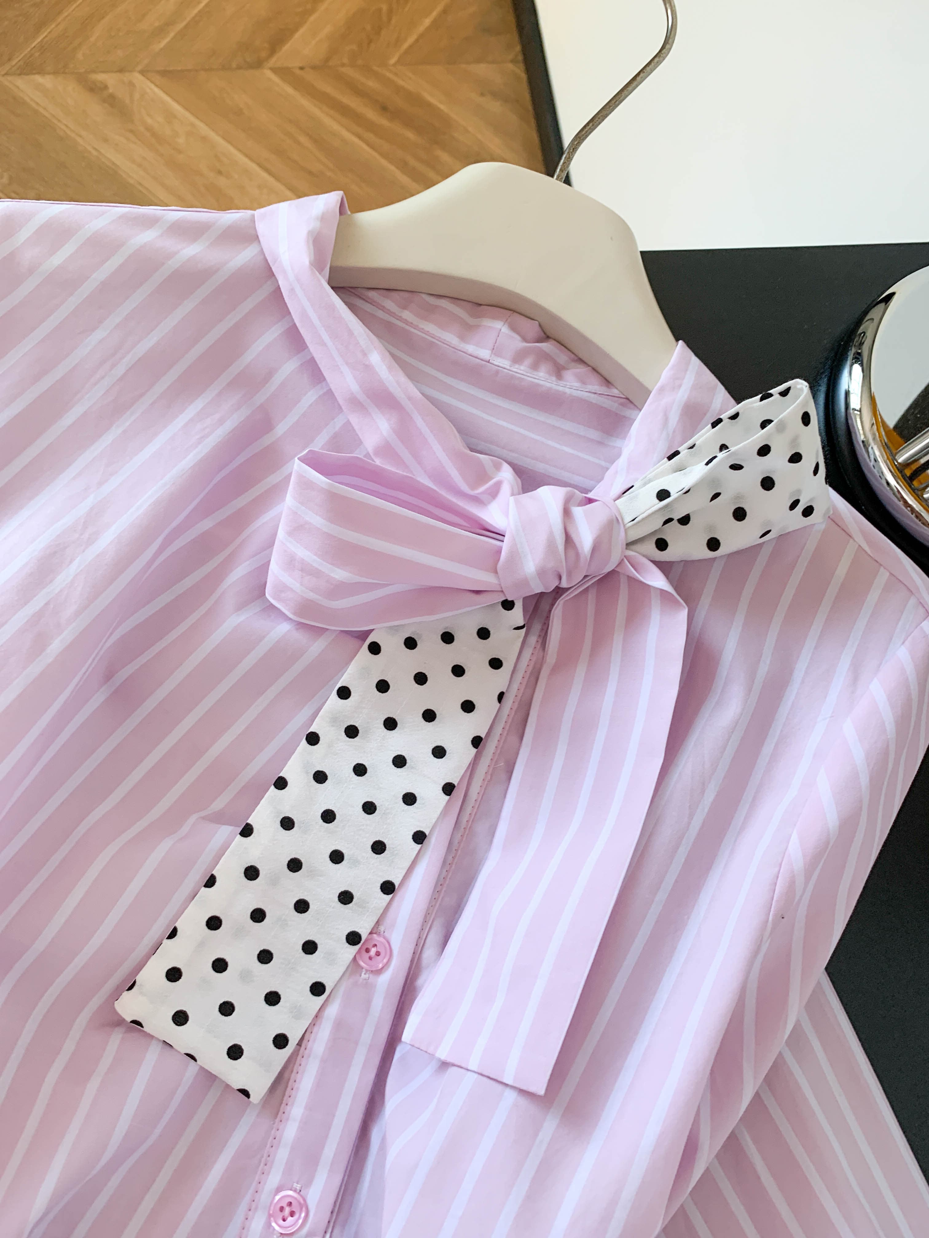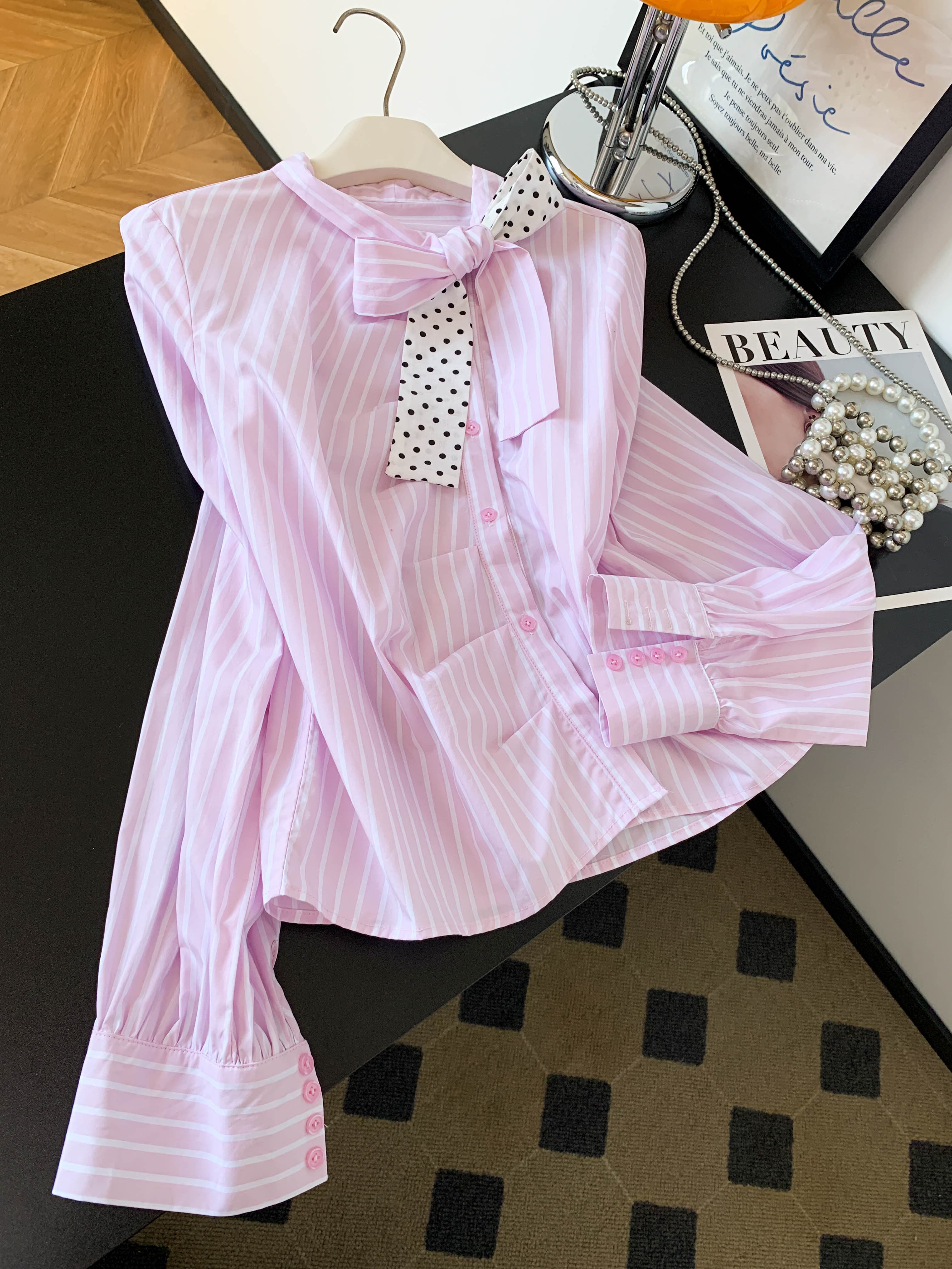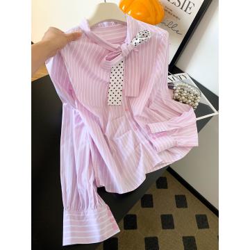 BY10225# 新款超好看通勤洋气减龄上衣高端轻奢粉色条纹蝴蝶结衬衫女 服裝批發女裝批發服飾貨源