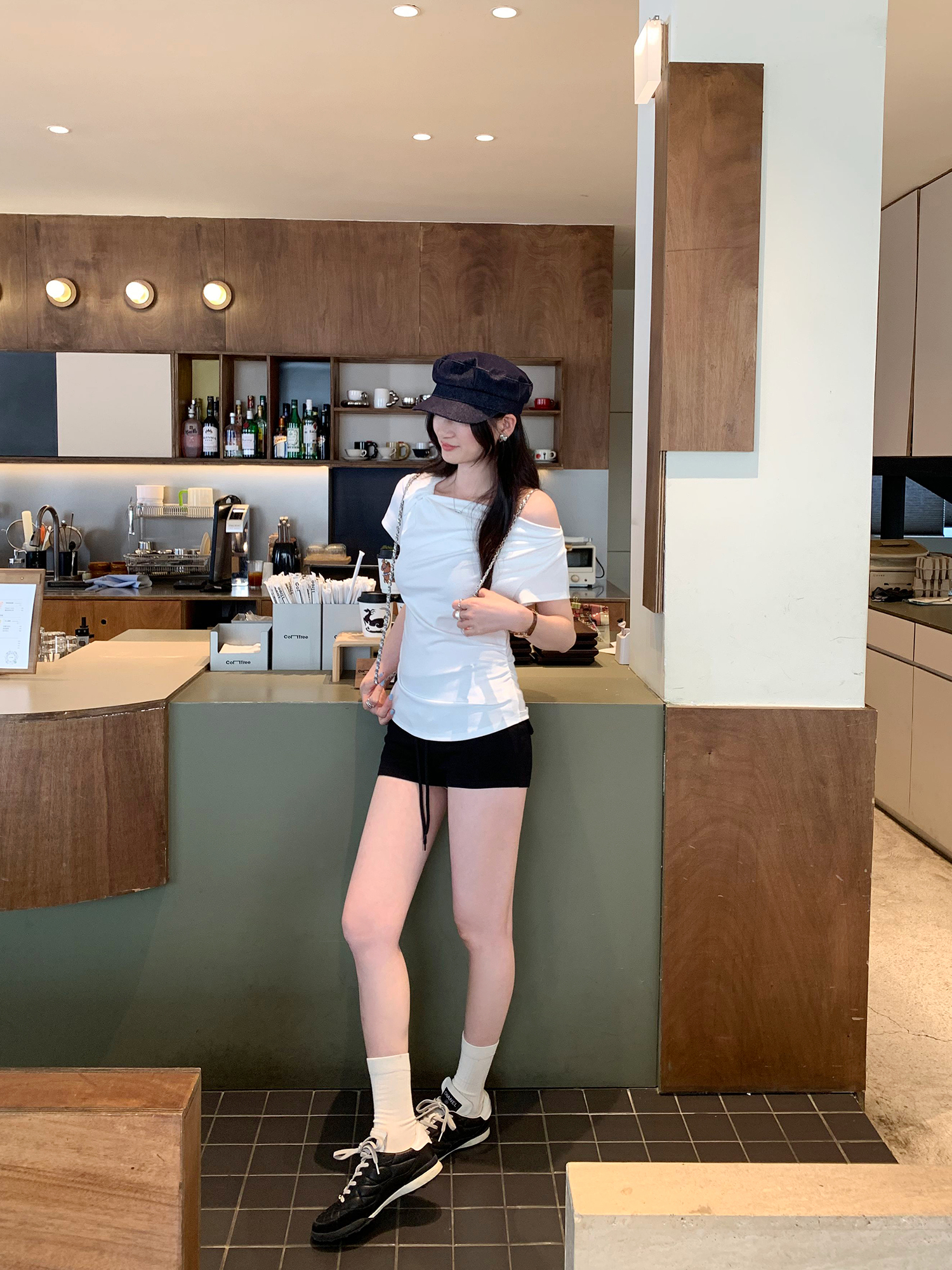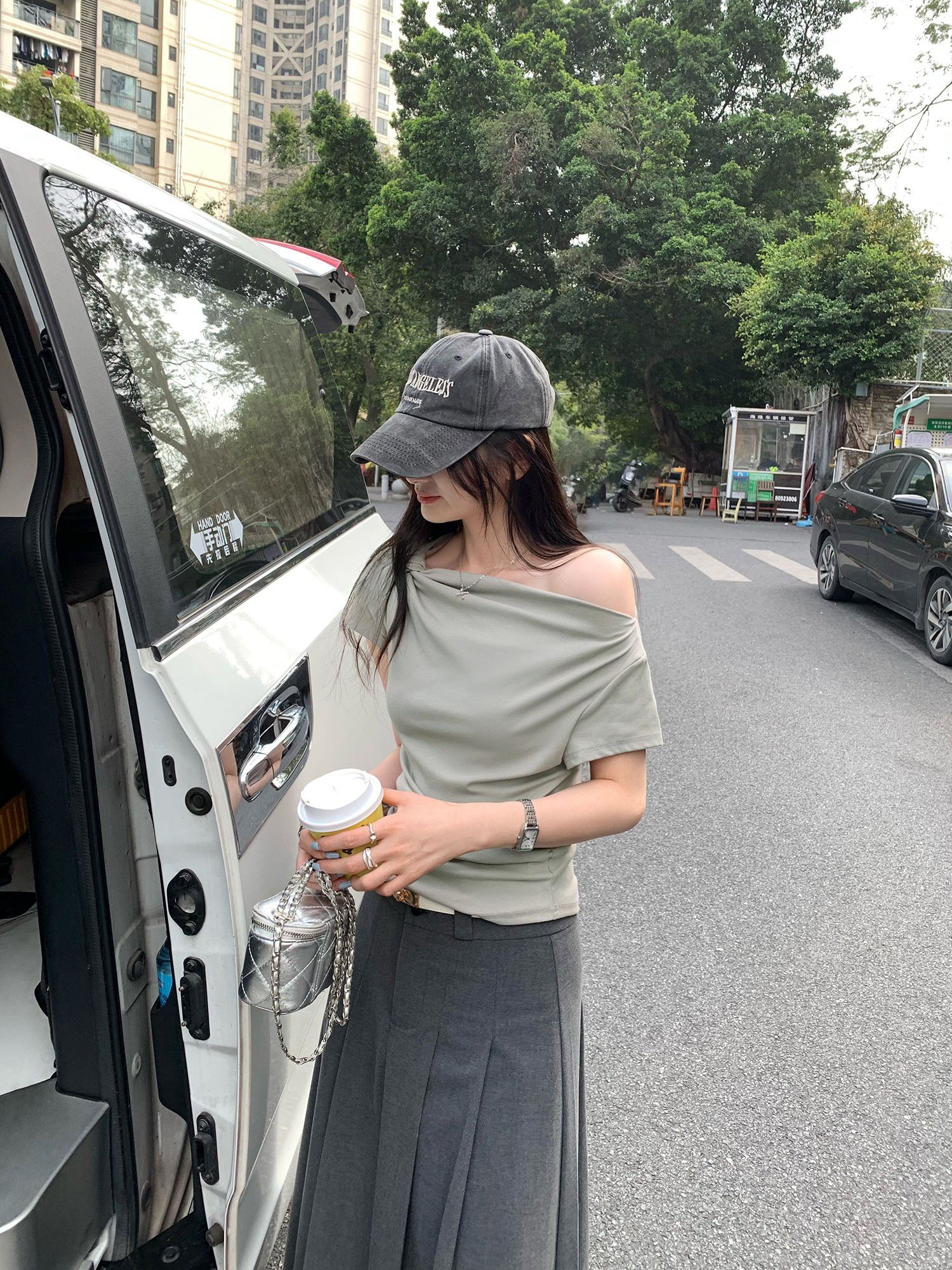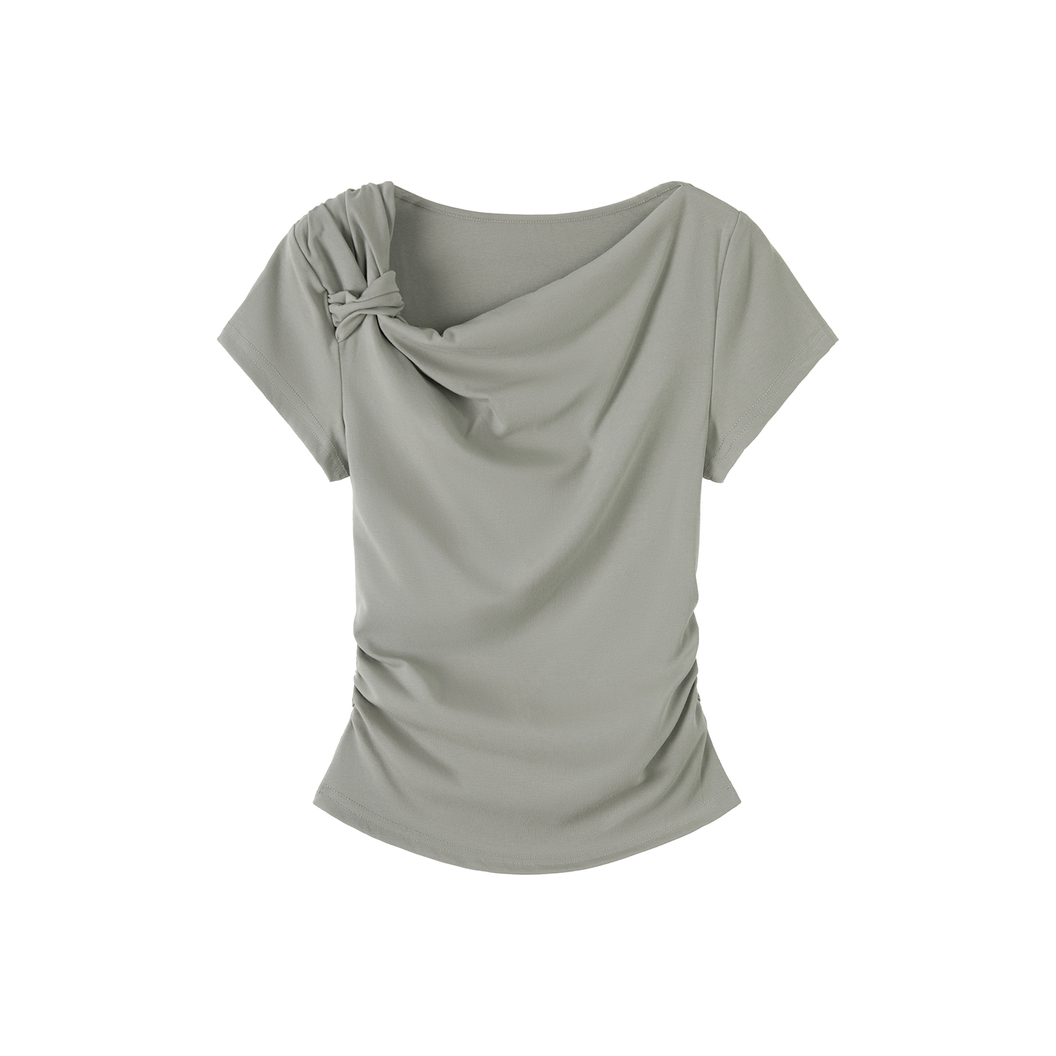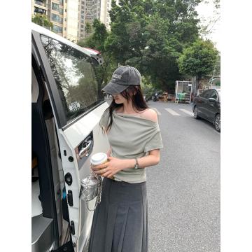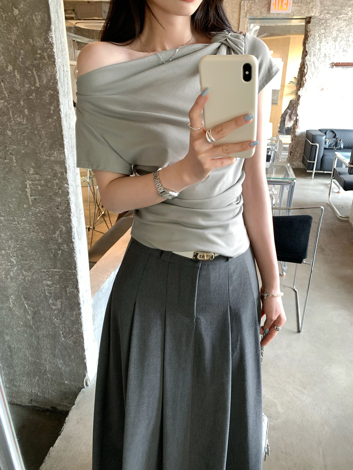 BY10287# 扭结荡领斜肩露肩收腰抽褶短袖T恤女夏季新款修身上衣 服裝批發女裝批發服飾貨源