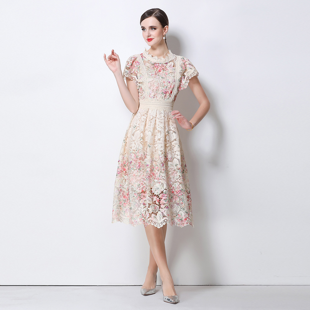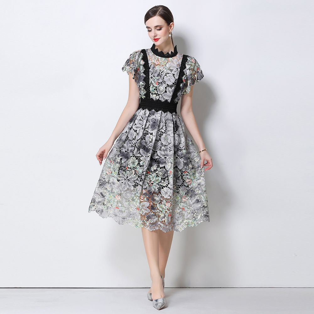 BY10317# 高端时尚短袖连衣裙女新款法式重工镂空钩花蕾丝收腰优雅长裙 服裝批發女裝批發服飾貨源