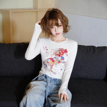 BY10460# 名媛风小马印花长袖T恤女春秋新款美式高级感修身显瘦上衣潮 服裝批發女裝批發服飾貨源