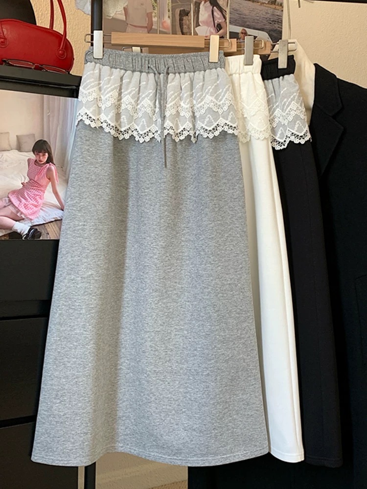 灰色蕾丝拼接半身裙女春季抽绳假两件包臀裙百搭松紧腰显瘦a字裙 服裝批發女裝批發服飾貨源