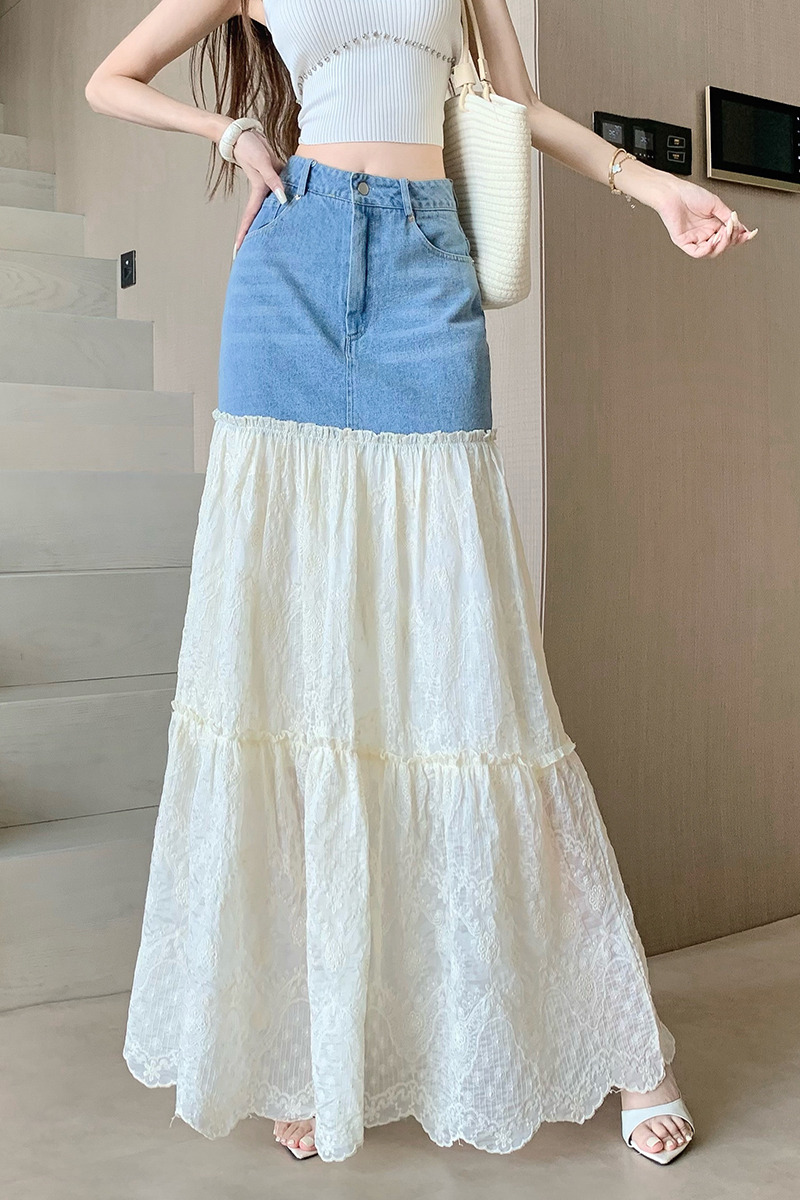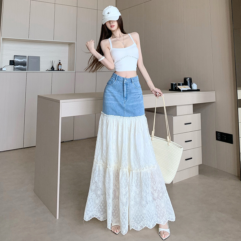 BY11826# 仙女蕾丝拼接半身裙女夏季薄款设计感拼接牛仔裙子显瘦网纱裙 服裝批發女裝批發服飾貨源
