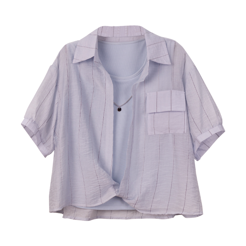 BY11838# 假两件浅短袖衬衫女夏新款背心叠穿两件套 服裝批發女裝批發服飾貨源