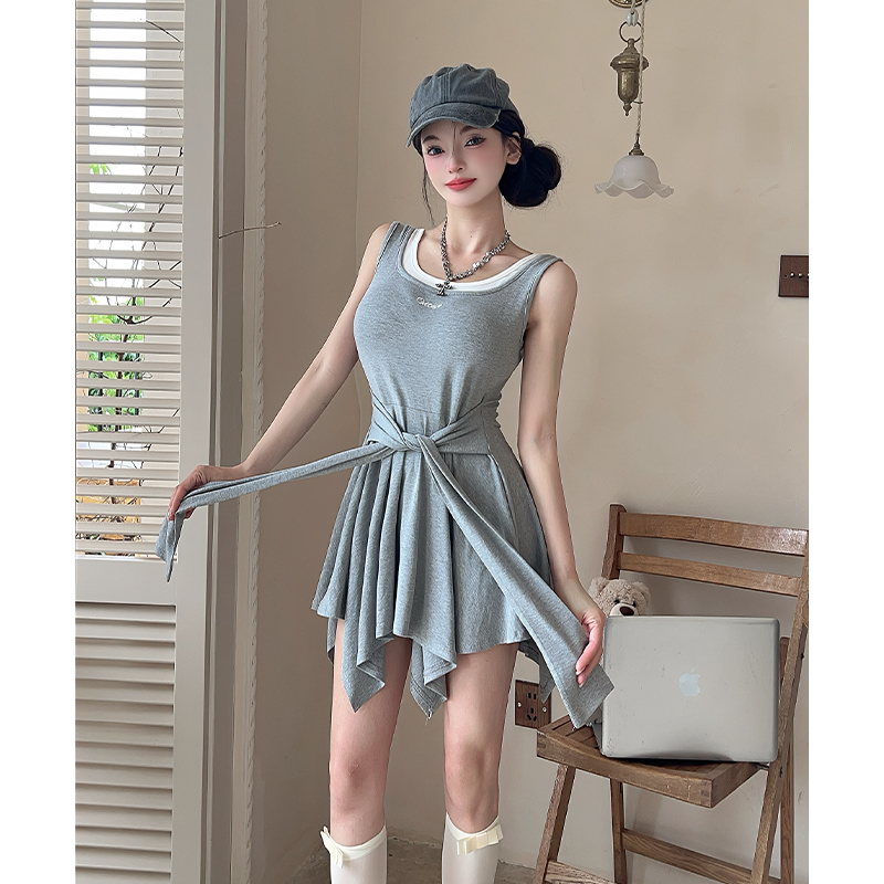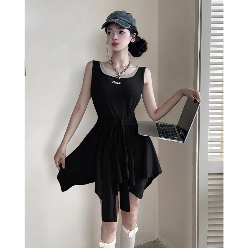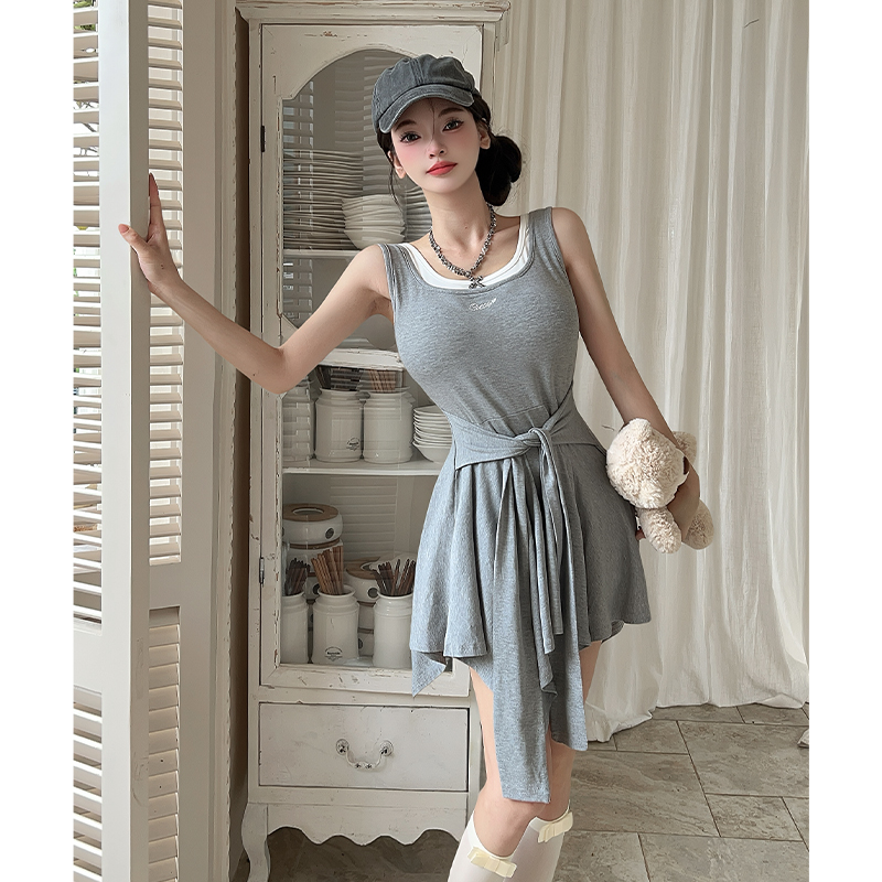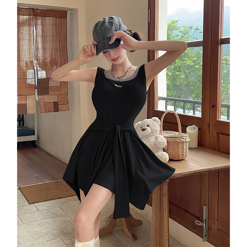 韩版甜辣修身显瘦刺绣拼接假两件连衣裙绑带收腰吊带裙 服裝批發女裝批發服飾貨源