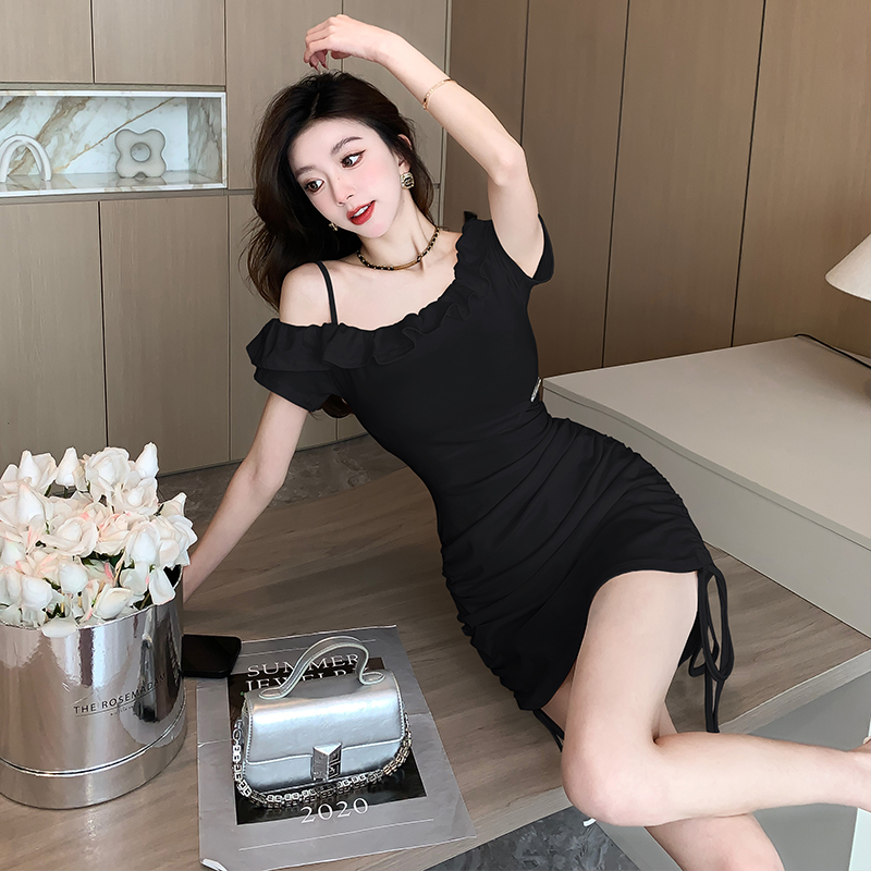 首页 > 短袖连衣裙、夜店装 > BY12077# 法式甜辣裙露肩荷叶边修身连衣裙收腰抽绳包臂短裙 服裝批發女裝批發服飾貨源