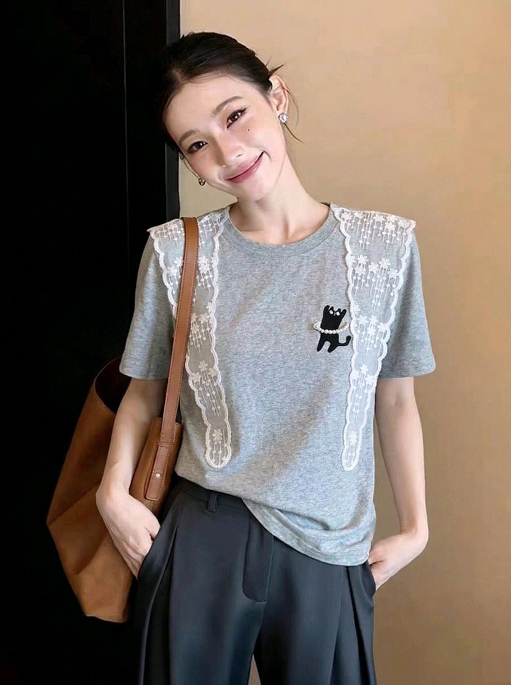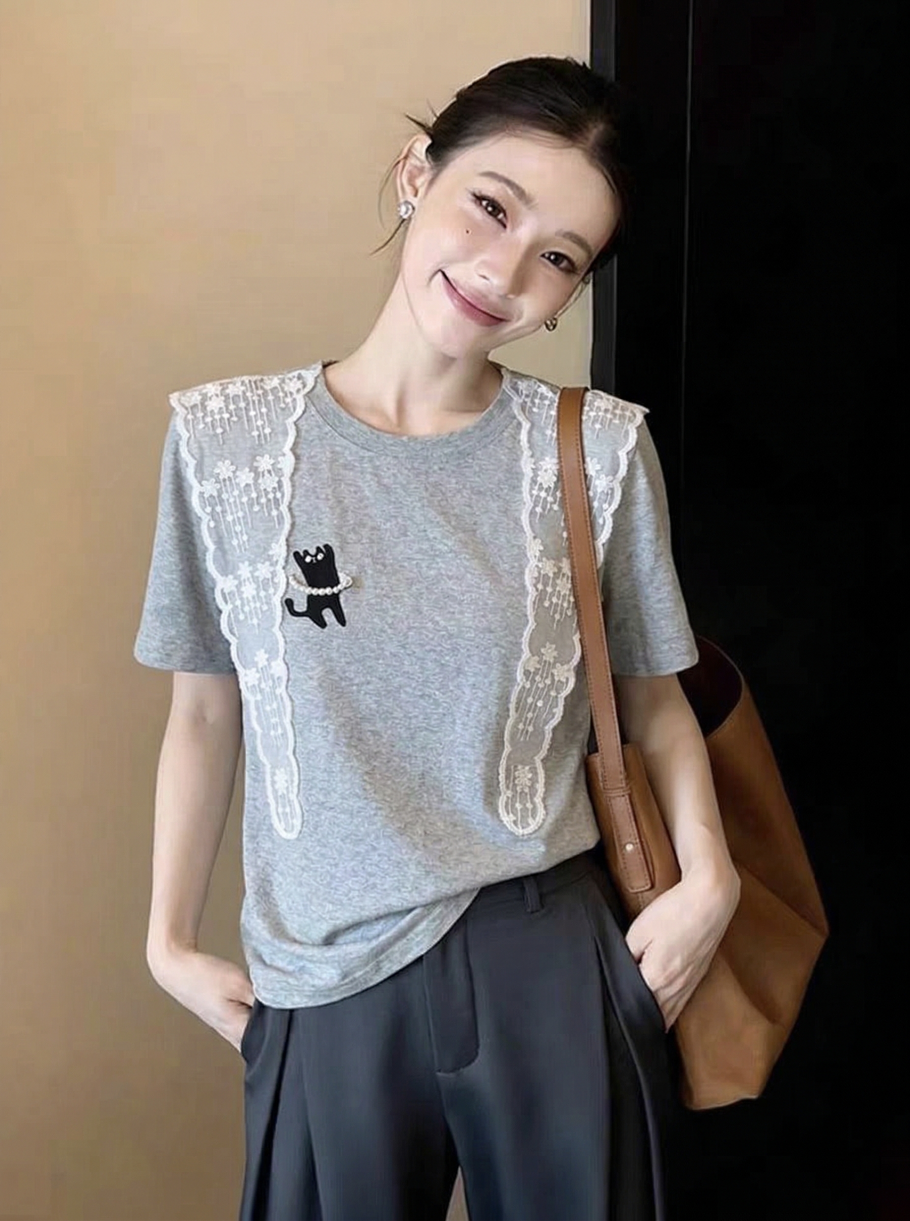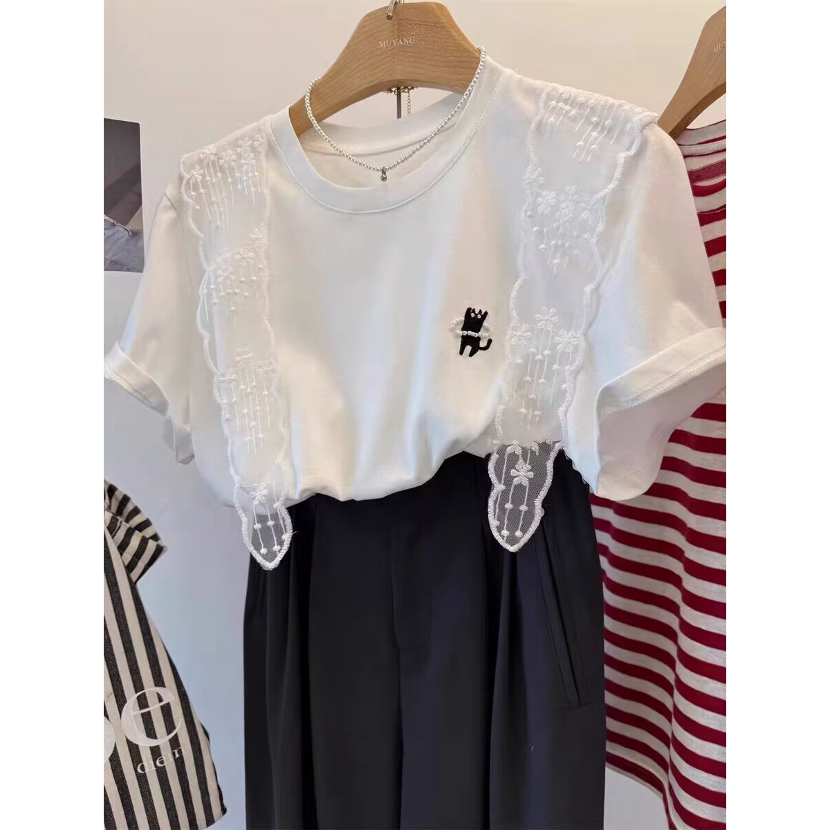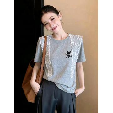 花朵蕾丝披肩珍珠小黑猫休闲短袖T恤女微宽松新款棉上衣 服裝批發女裝批發服飾貨源