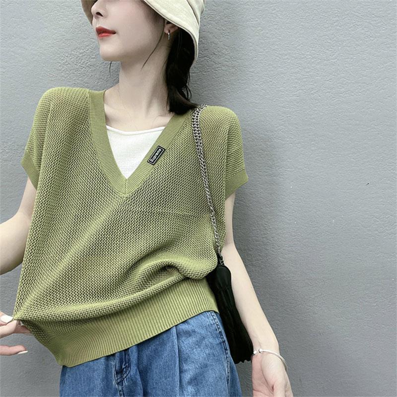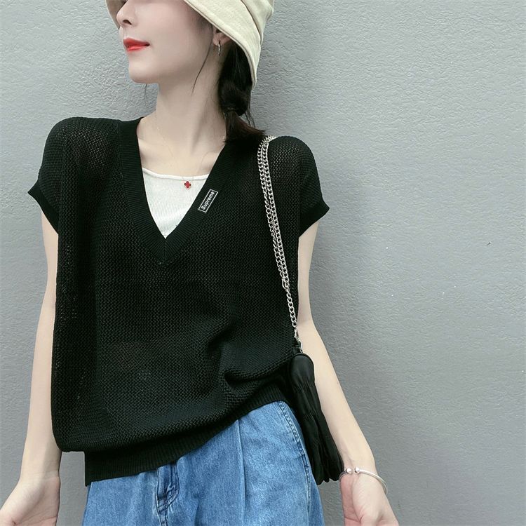 假两件短袖T恤女夏季薄款新款透气V领针织衫女百搭镂空上衣女 服裝批發女裝批發服飾貨源