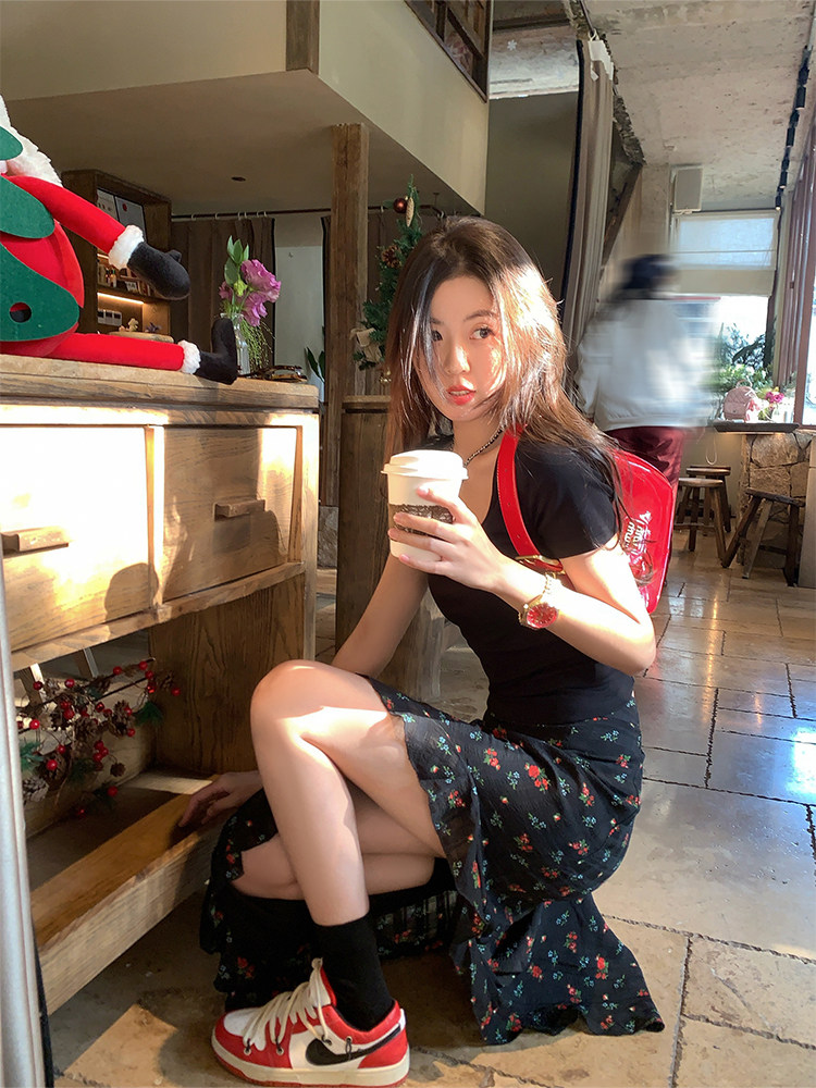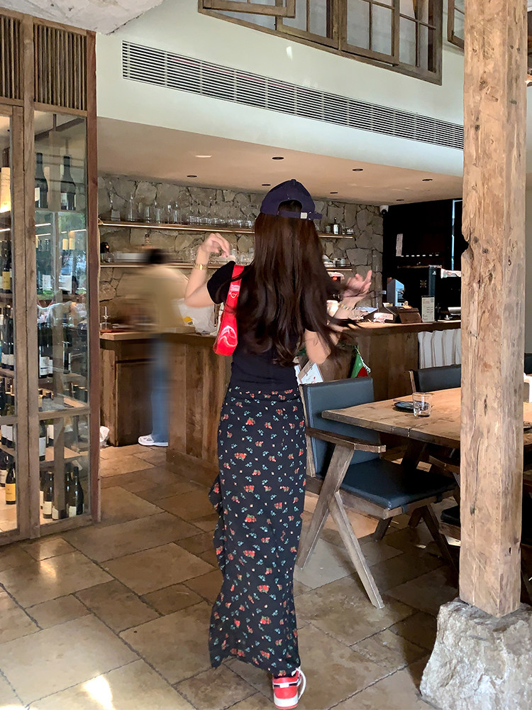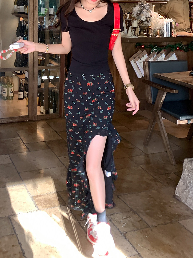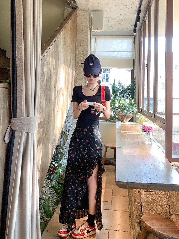 黑色碎花不规则开叉半身裙女春夏新品设计感显瘦包臀裙 服裝批發女裝批發服飾貨源