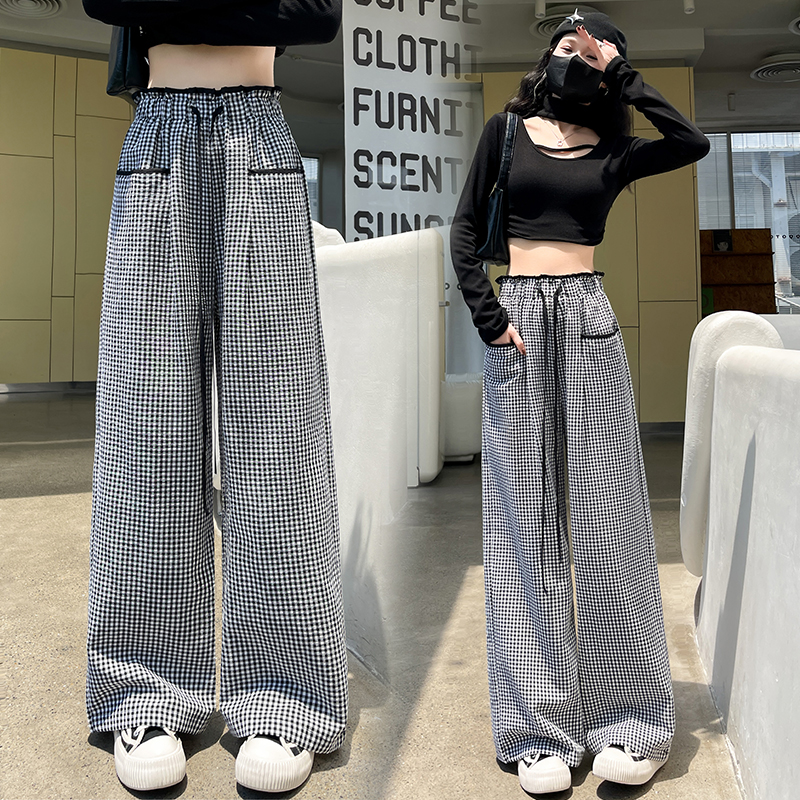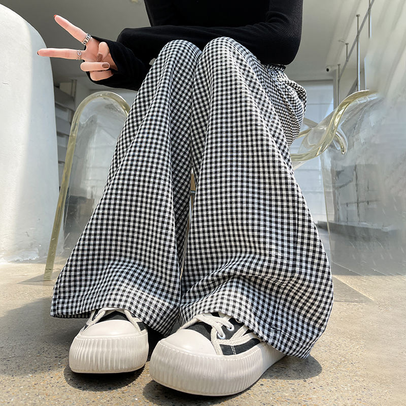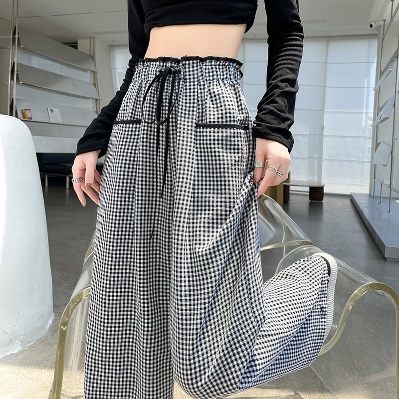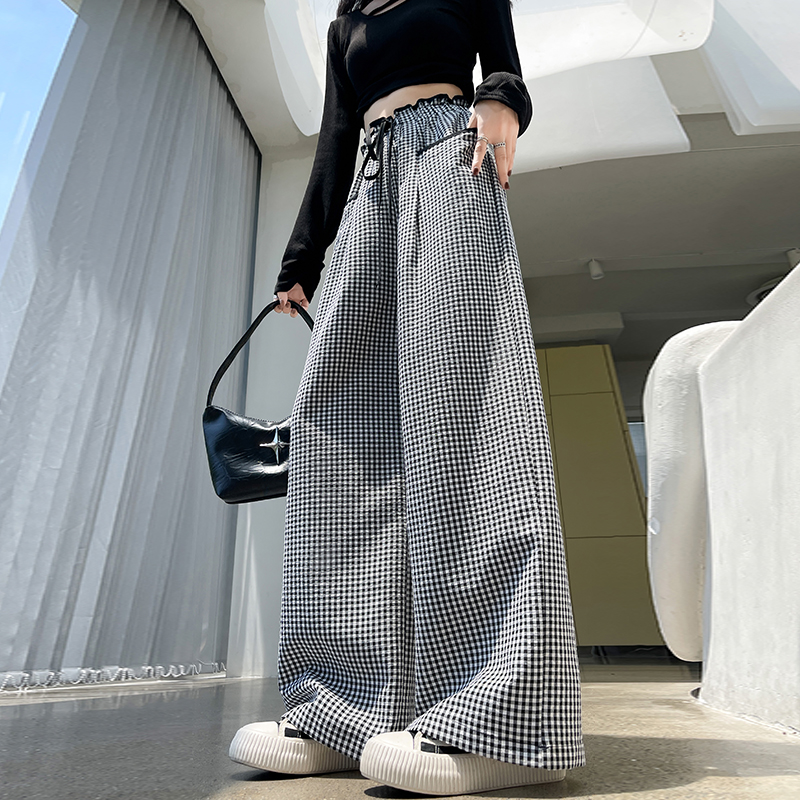 时尚格子休闲裤女高腰显瘦设计感直筒阔腿长裤 服裝批發女裝批發服飾貨源