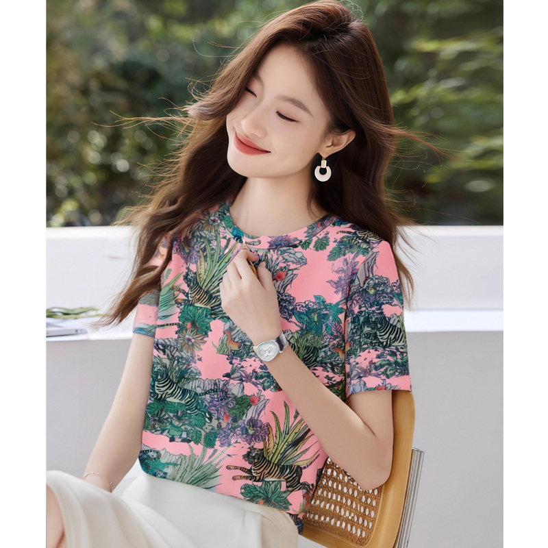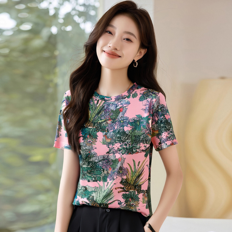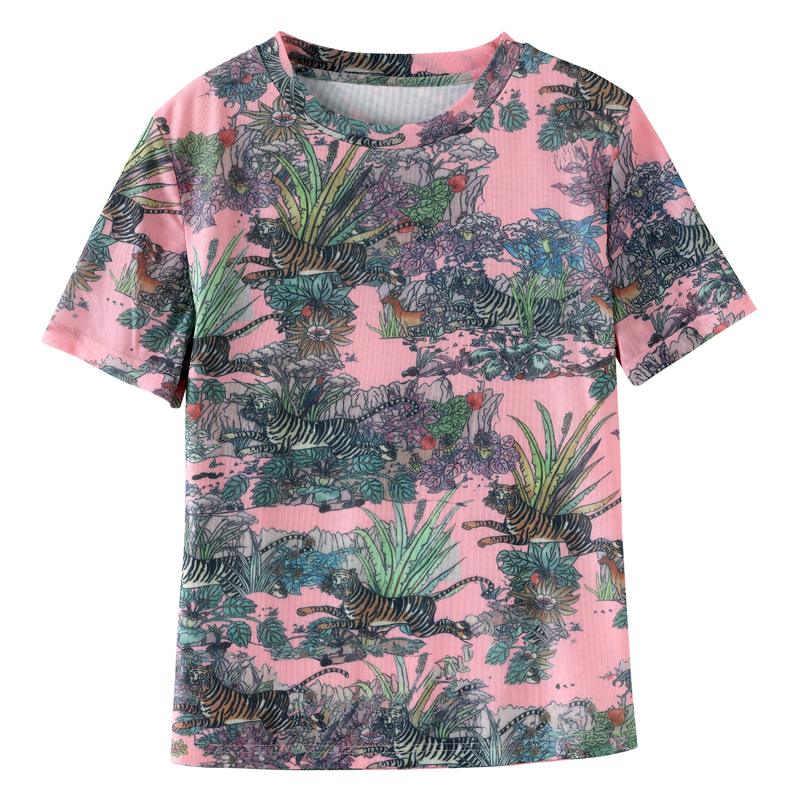 欧货夏季复古印花网纱冰丝短袖t恤女修身洋气百搭别致打底上衣 服裝批發女裝批發服飾貨源