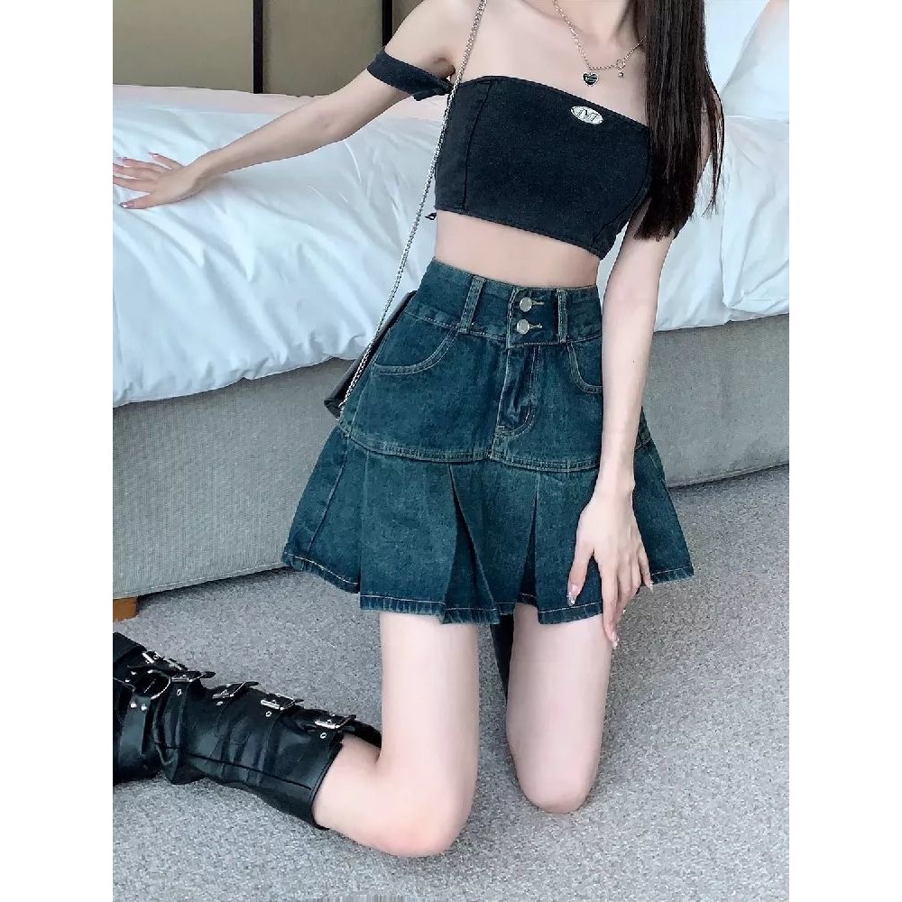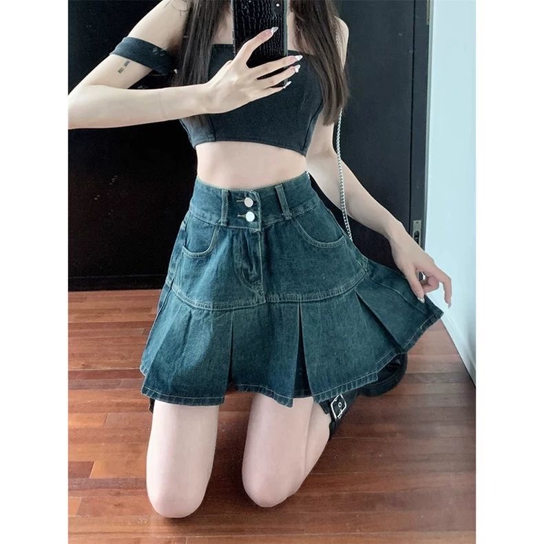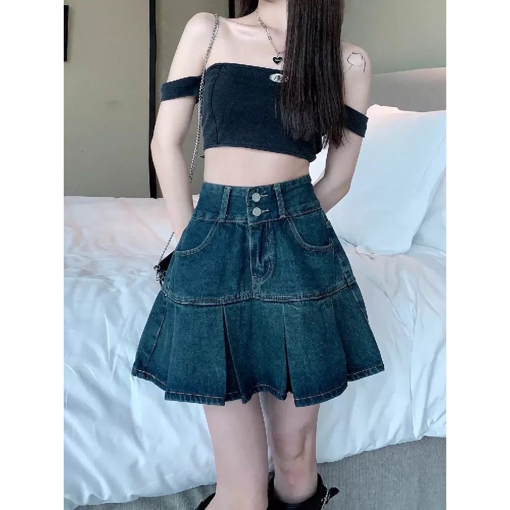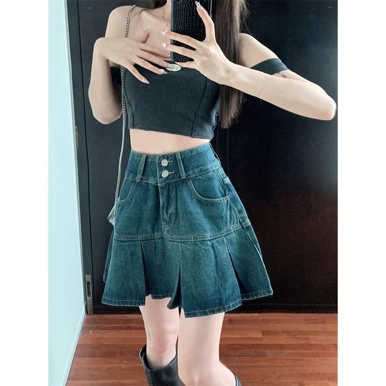 BY13136# 高腰复古百褶牛仔半身裙女夏季遮肚显瘦设计感小众a字短裙子 服裝批發女裝批發服飾貨源