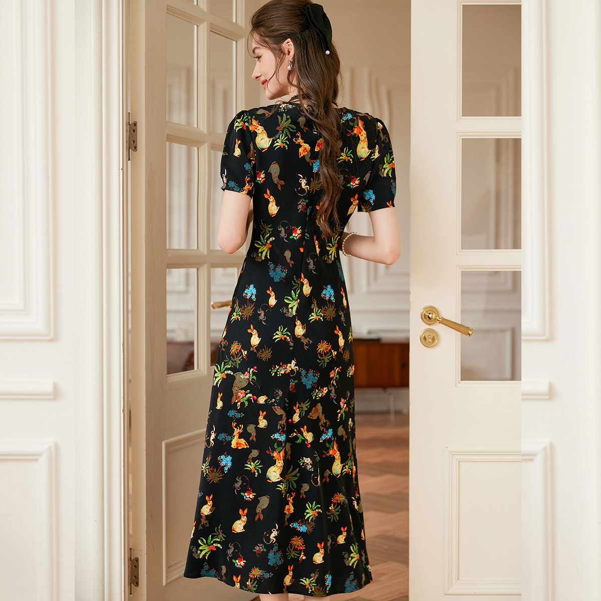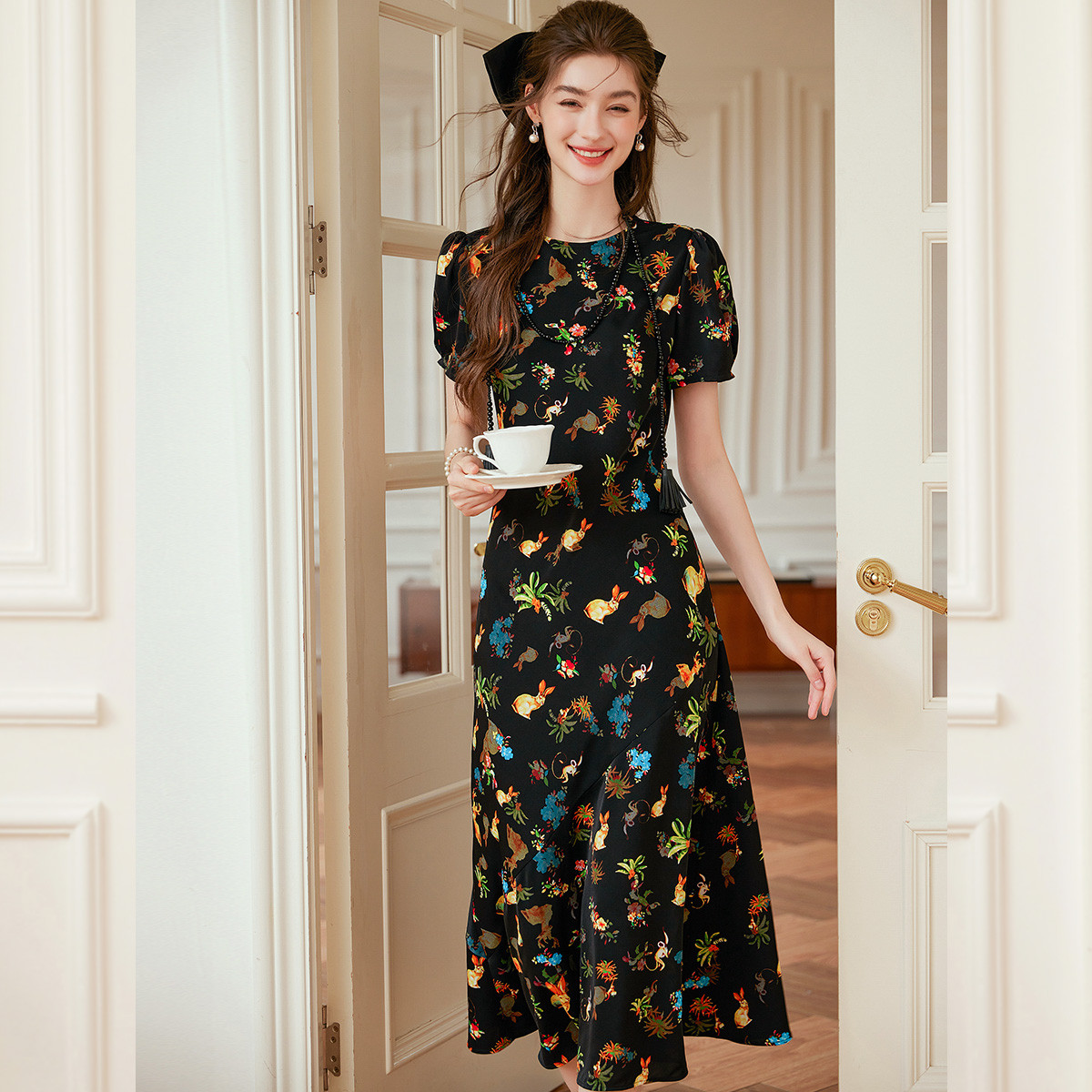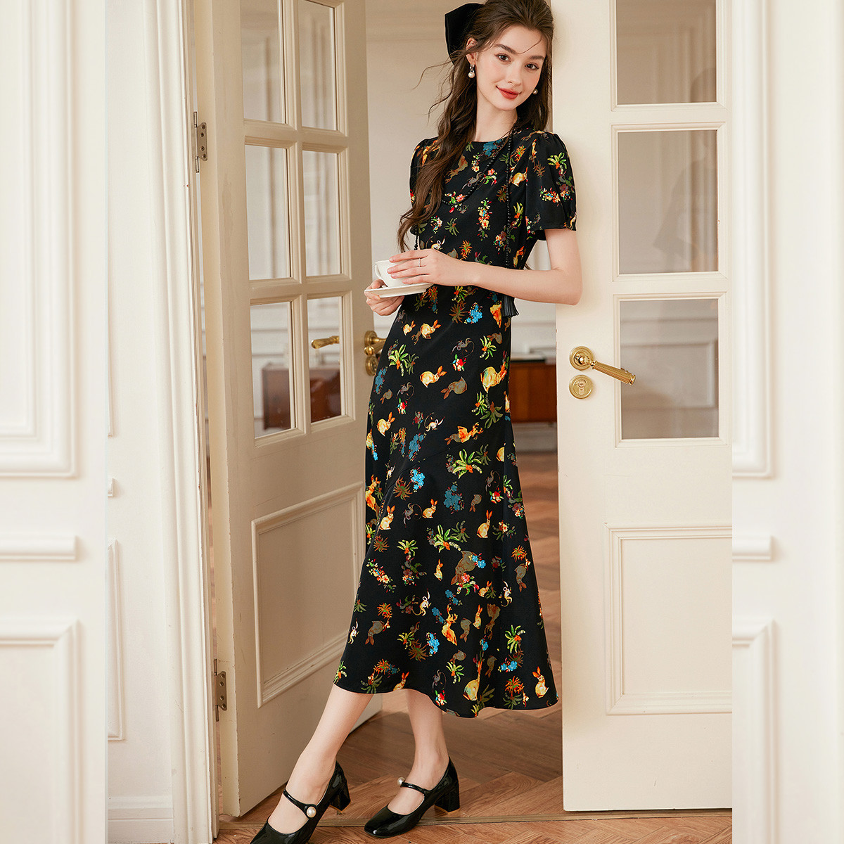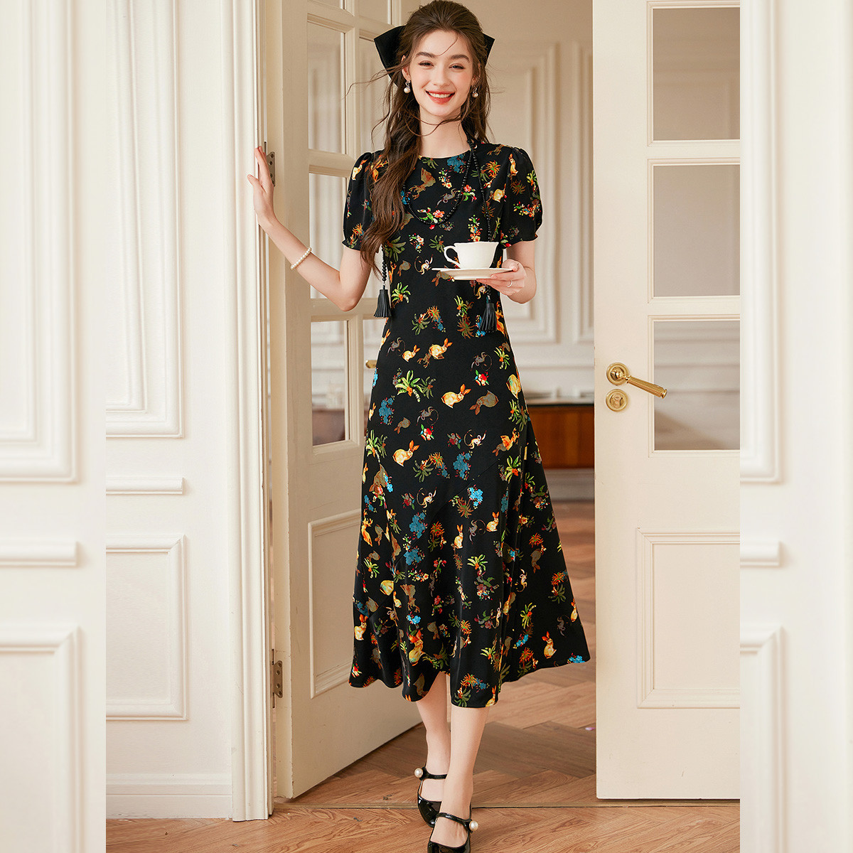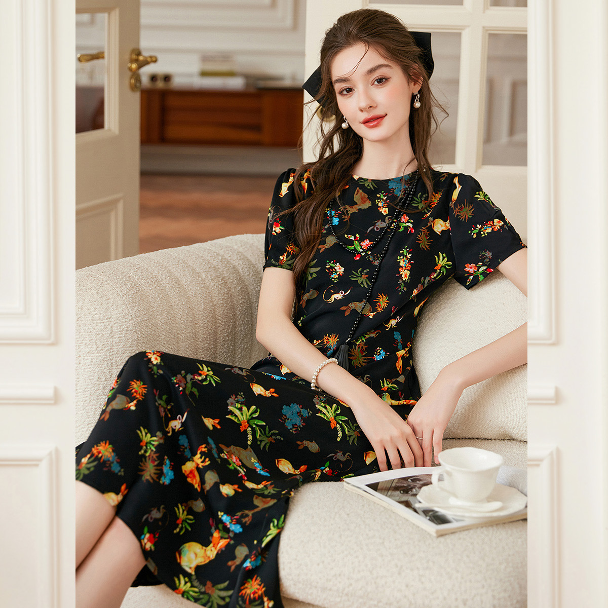 BY13179# 布料柔软有垂感夏季新款时尚微弹圆领印花伞摆女式连衣裙 服裝批發女裝批發服飾貨源