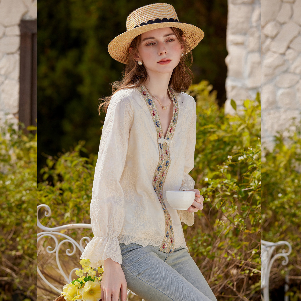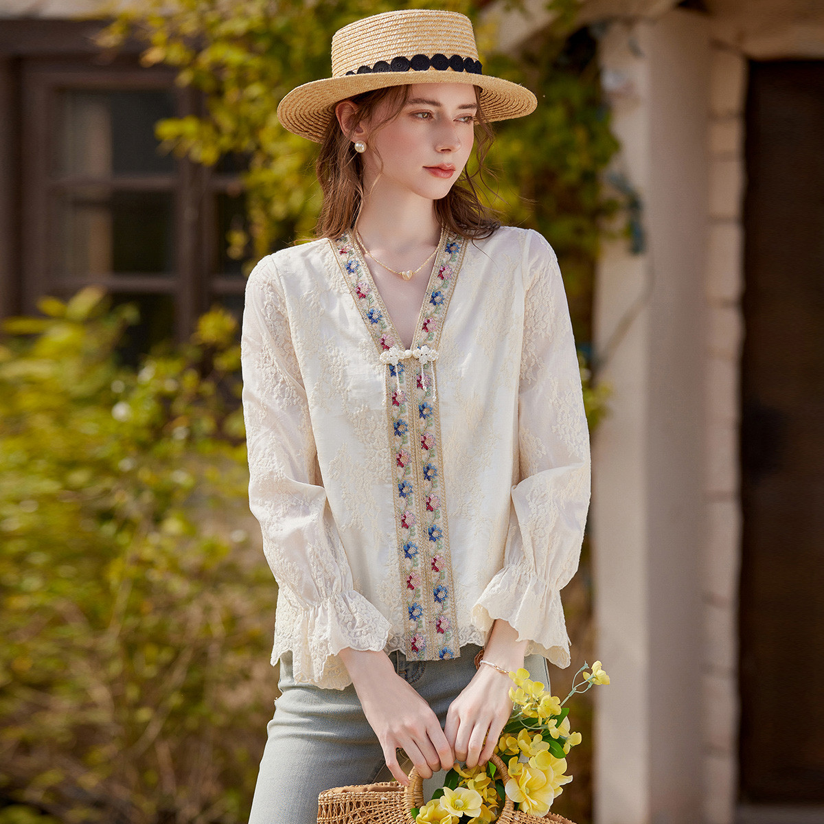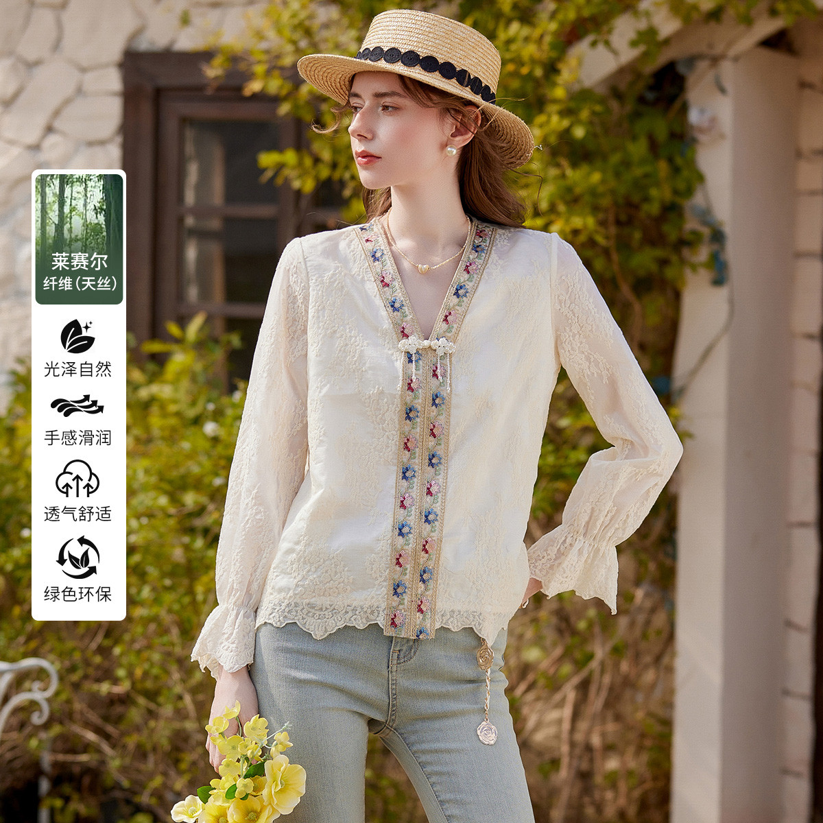 BY13180# 含莱赛尔面料衬衣春夏中式浪漫撞色绣花V领长袖衬衫 服裝批發女裝批發服飾貨源