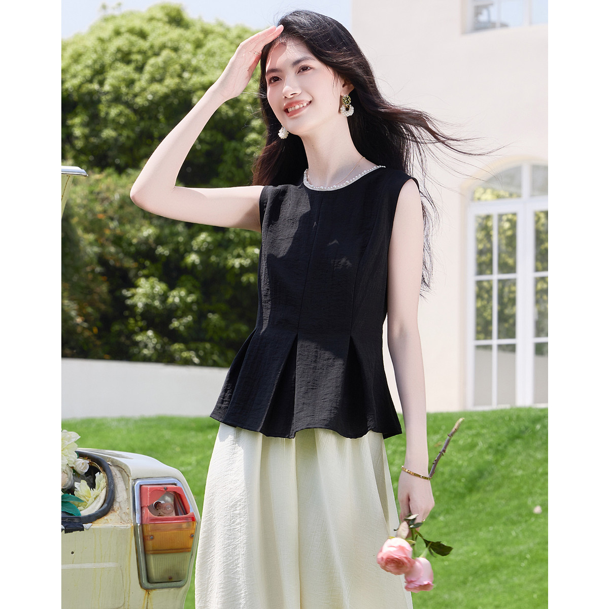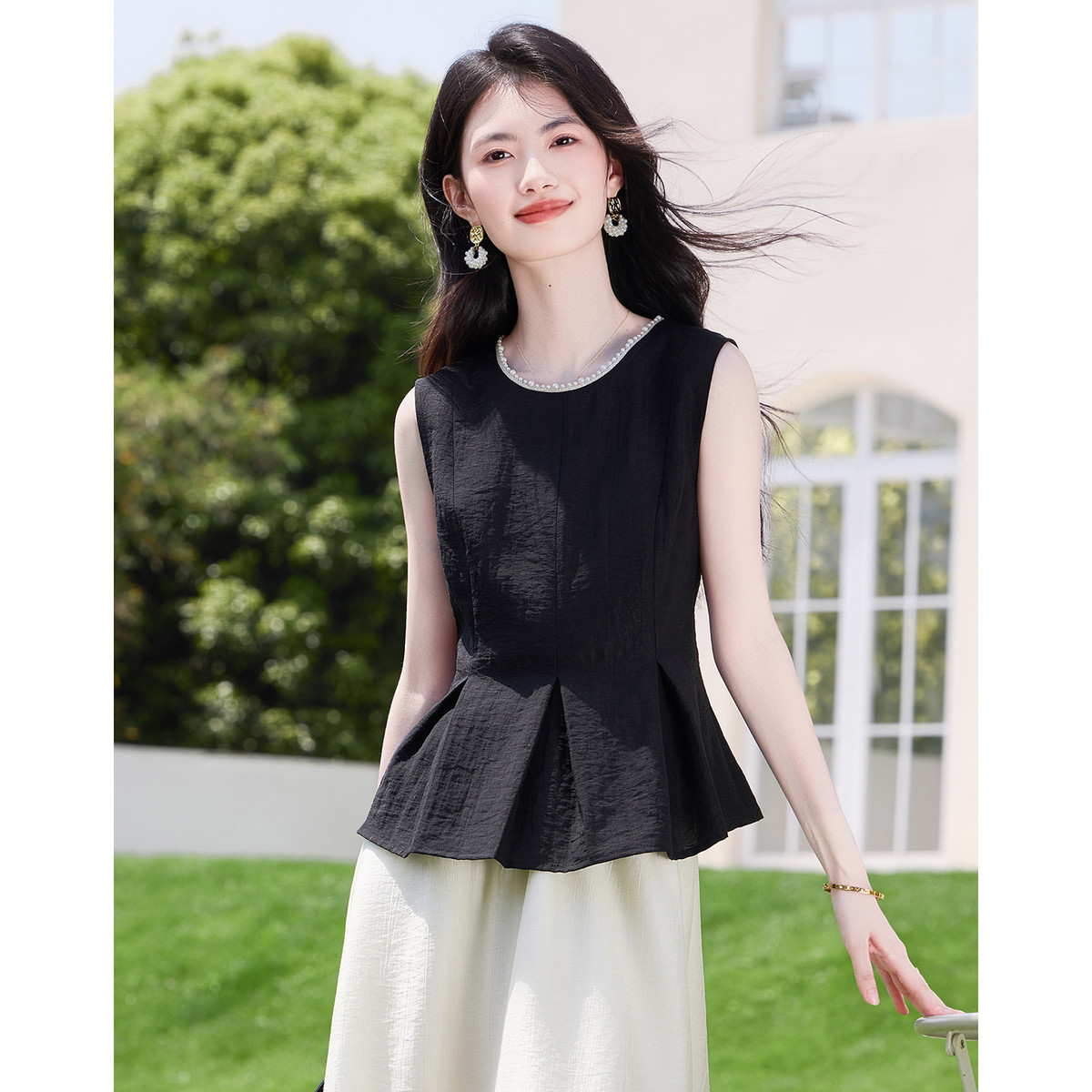 BY13181# 钉珠圆领法式优雅无袖衬衫女夏季新款高级感气质百搭显瘦上衣 服裝批發女裝批發服飾貨源