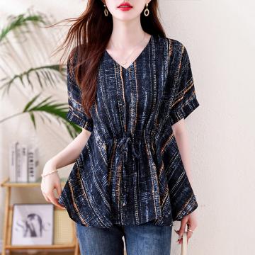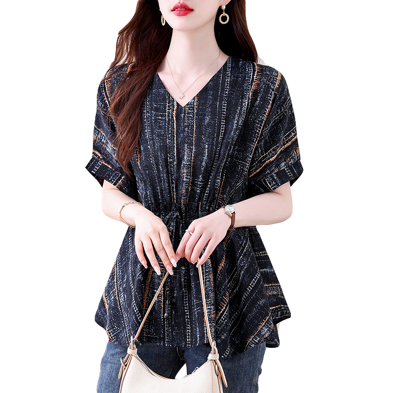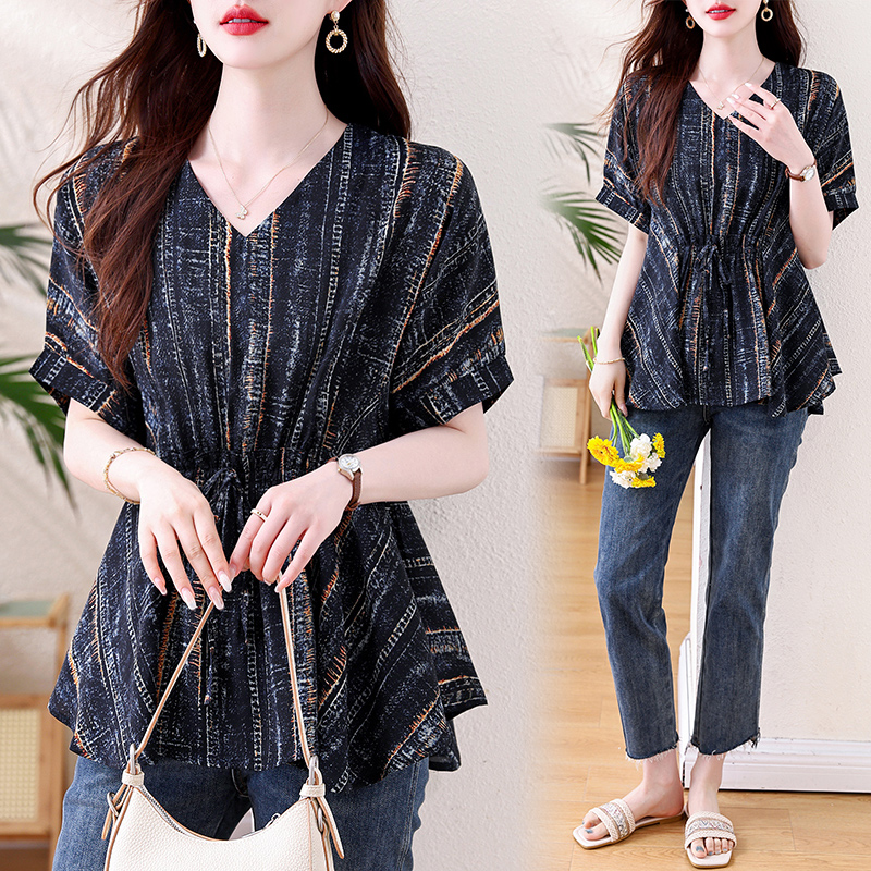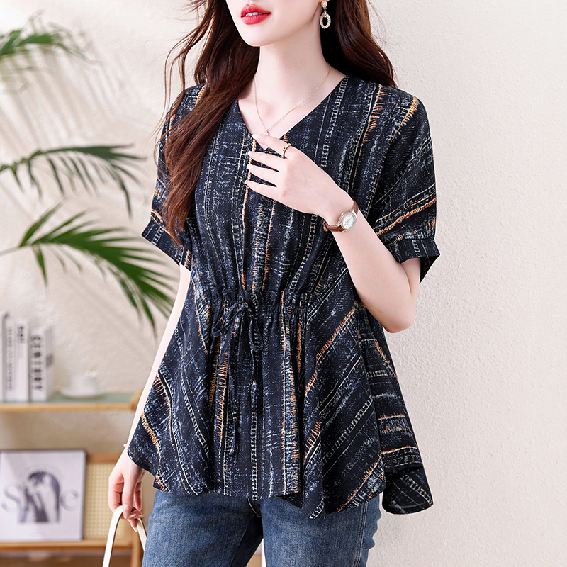 BY13210# 大码设计感小众系带收腰短袖衬衫女夏胖MM遮肉显瘦不规则雪纺上衣 服裝批發女裝批發服飾貨源