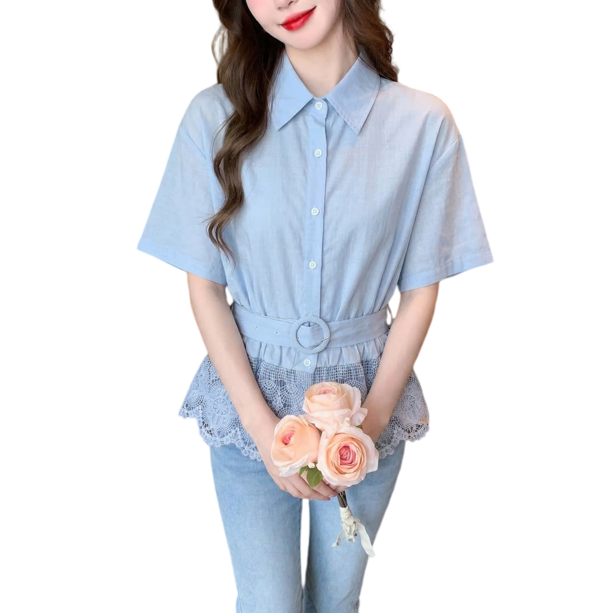 BY13219# 夏季新款蕾丝拼接翻领衬衫女设计感气质收腰显瘦开衫上衣 服裝批發女裝批發服飾貨源