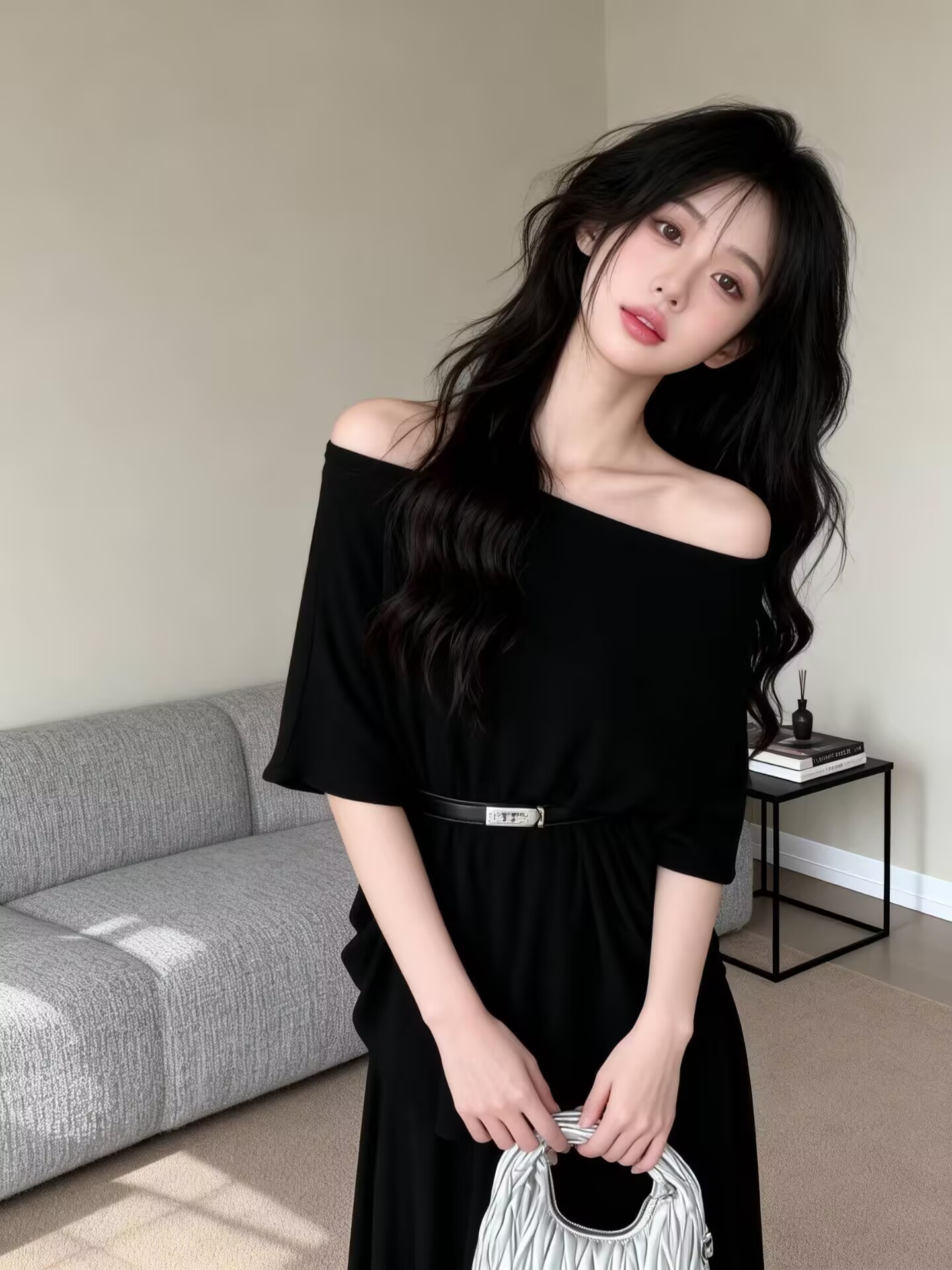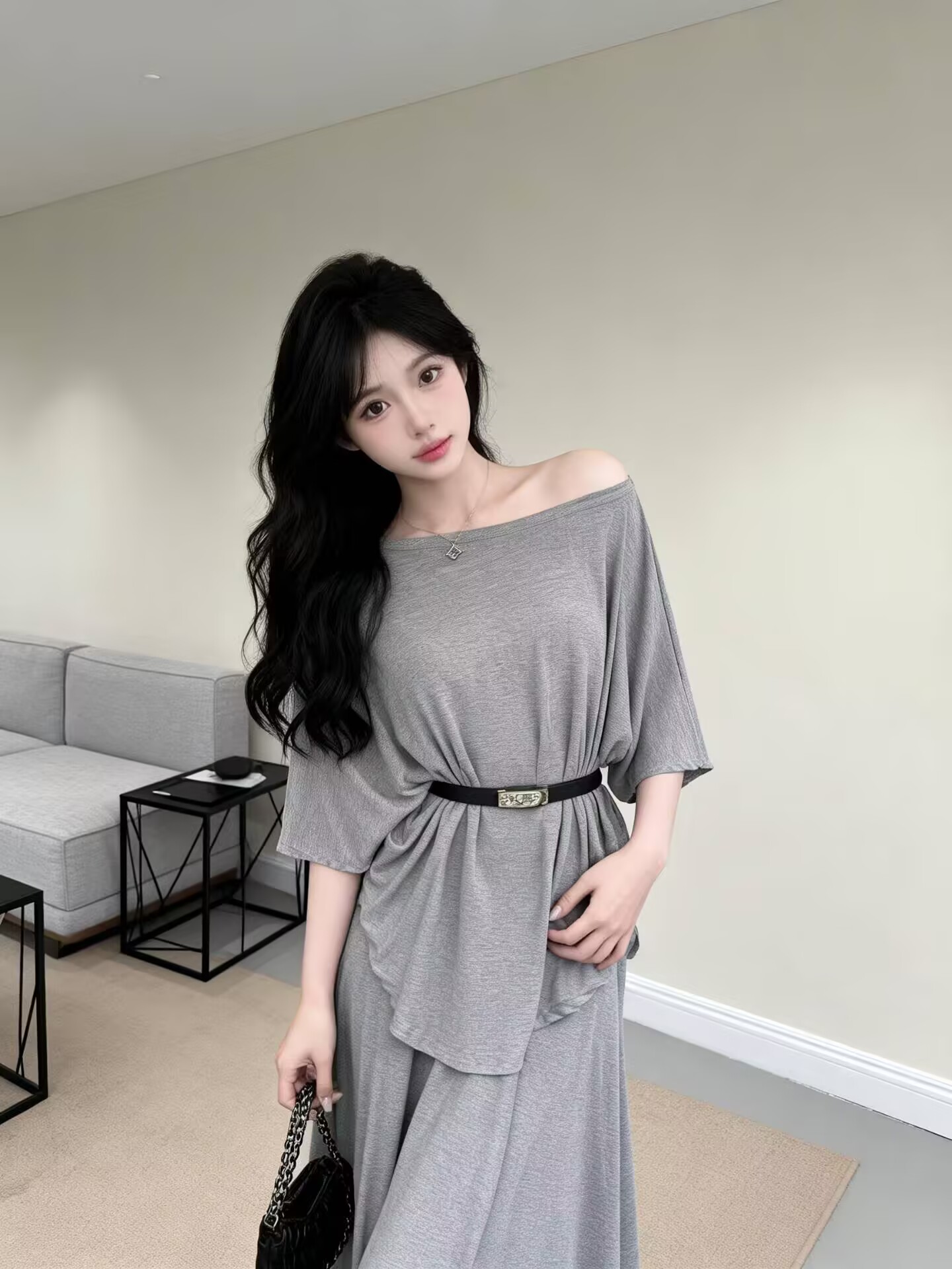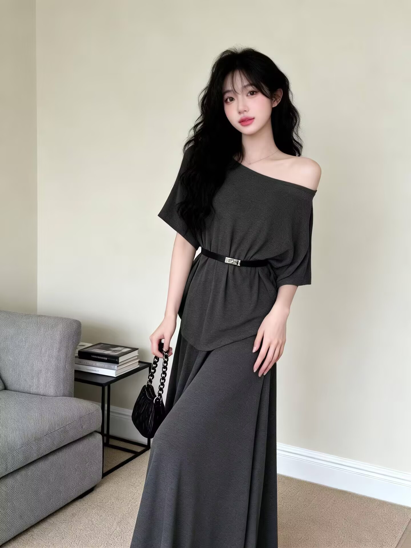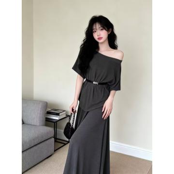 BY13468# 新款洋气设计感斜肩收腰显瘦上衣+松紧腰半身裙+腰带三件套 服裝批發女裝批發服飾貨源
