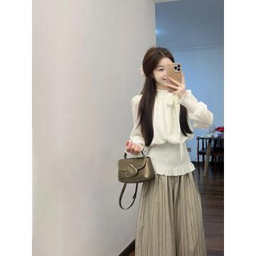 BY13481# 时尚套装女春秋新款法式气质系带领长袖衬衫搭配条纹阔腿裤两件套 服裝批發女裝批發服飾貨源