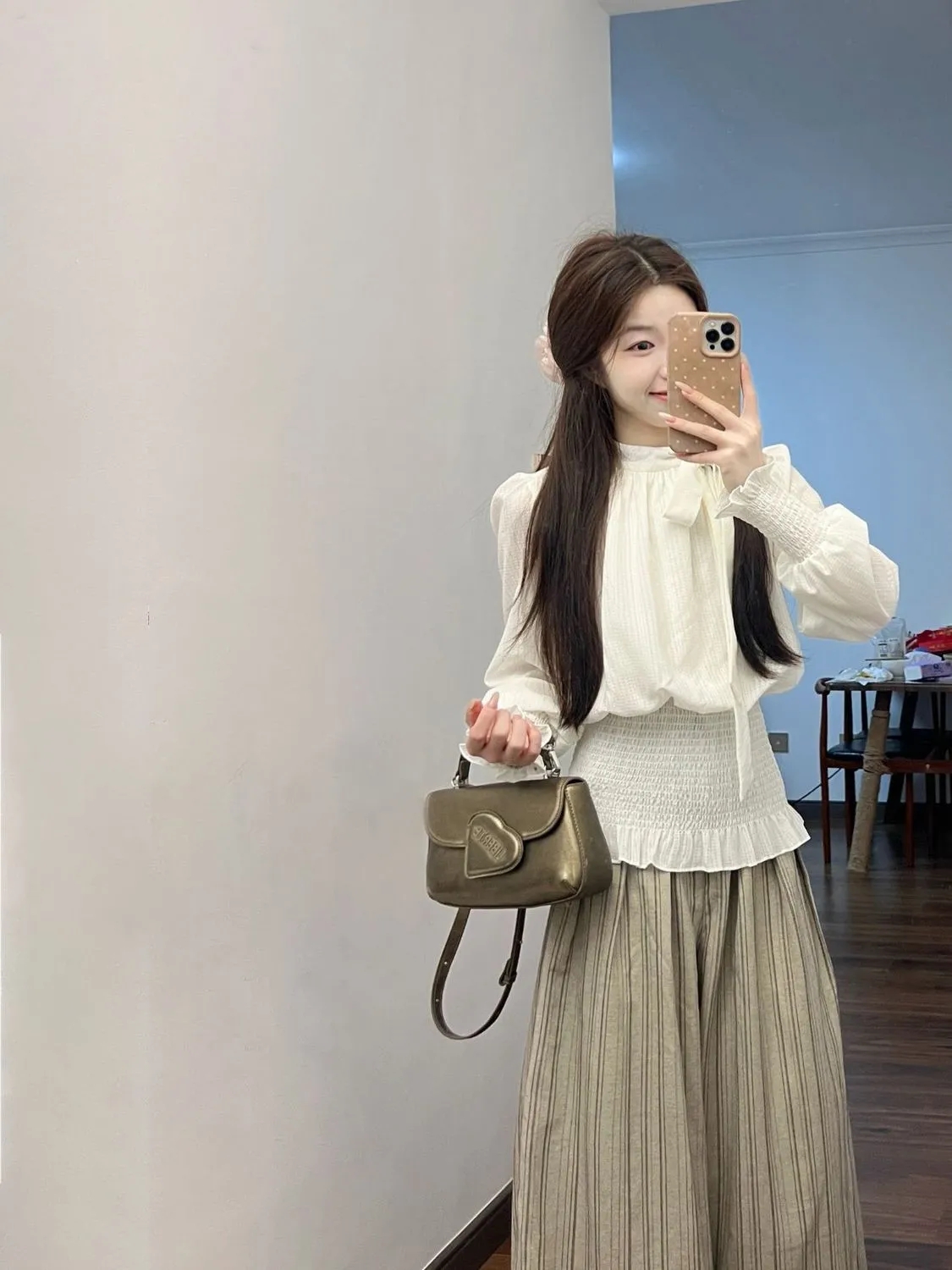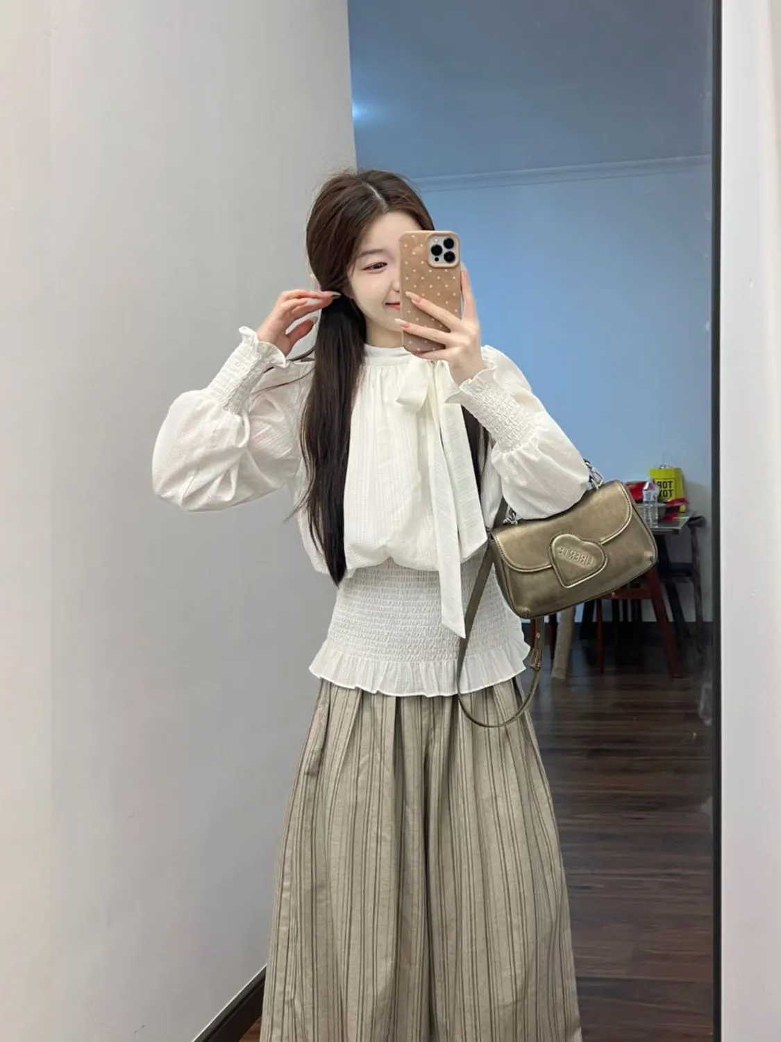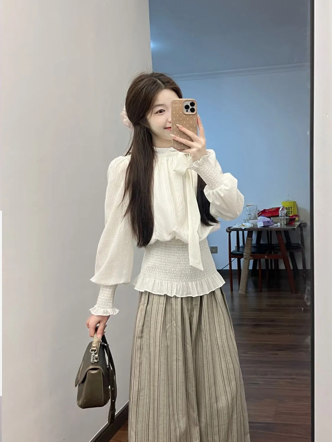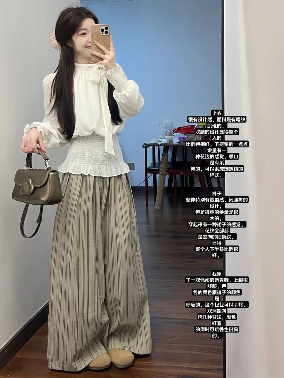 系带收腰衬衫+条纹裤