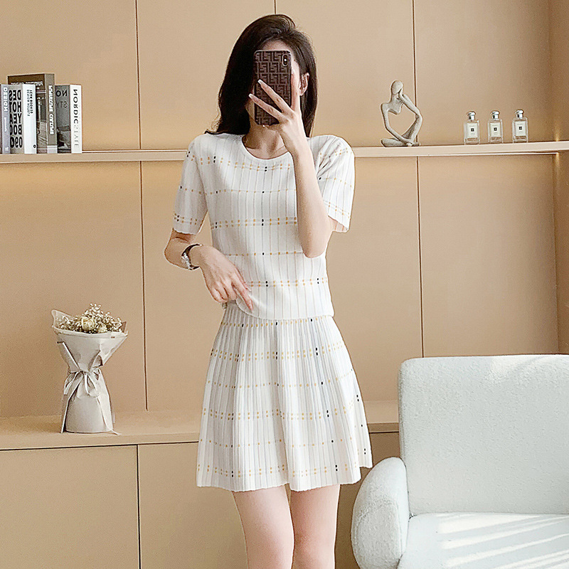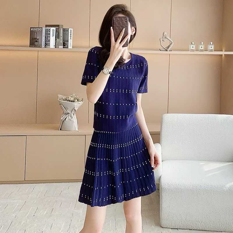 BY13491# 小香风冰丝针织套装女夏季新款时尚休闲短袖套装两件套装裙子 服裝批發女裝批發服飾貨源