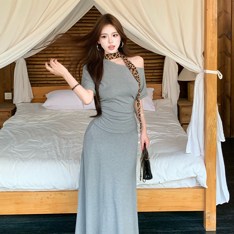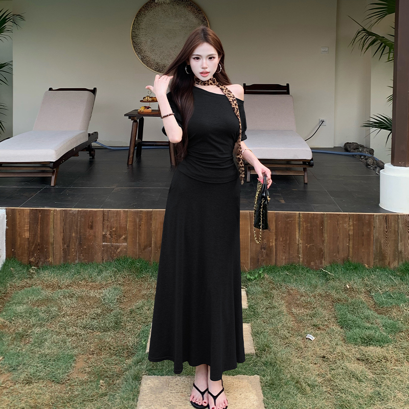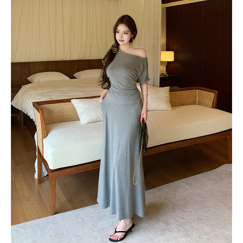 首页 > 韩版套装 > BY15070# 夏季新款法式慵懒高级感气质斜肩上衣+半身裙+飘带时尚三件套 服裝批發女裝批發服飾貨源