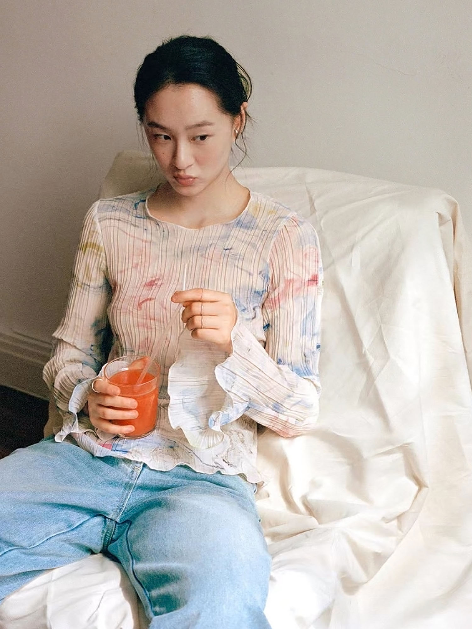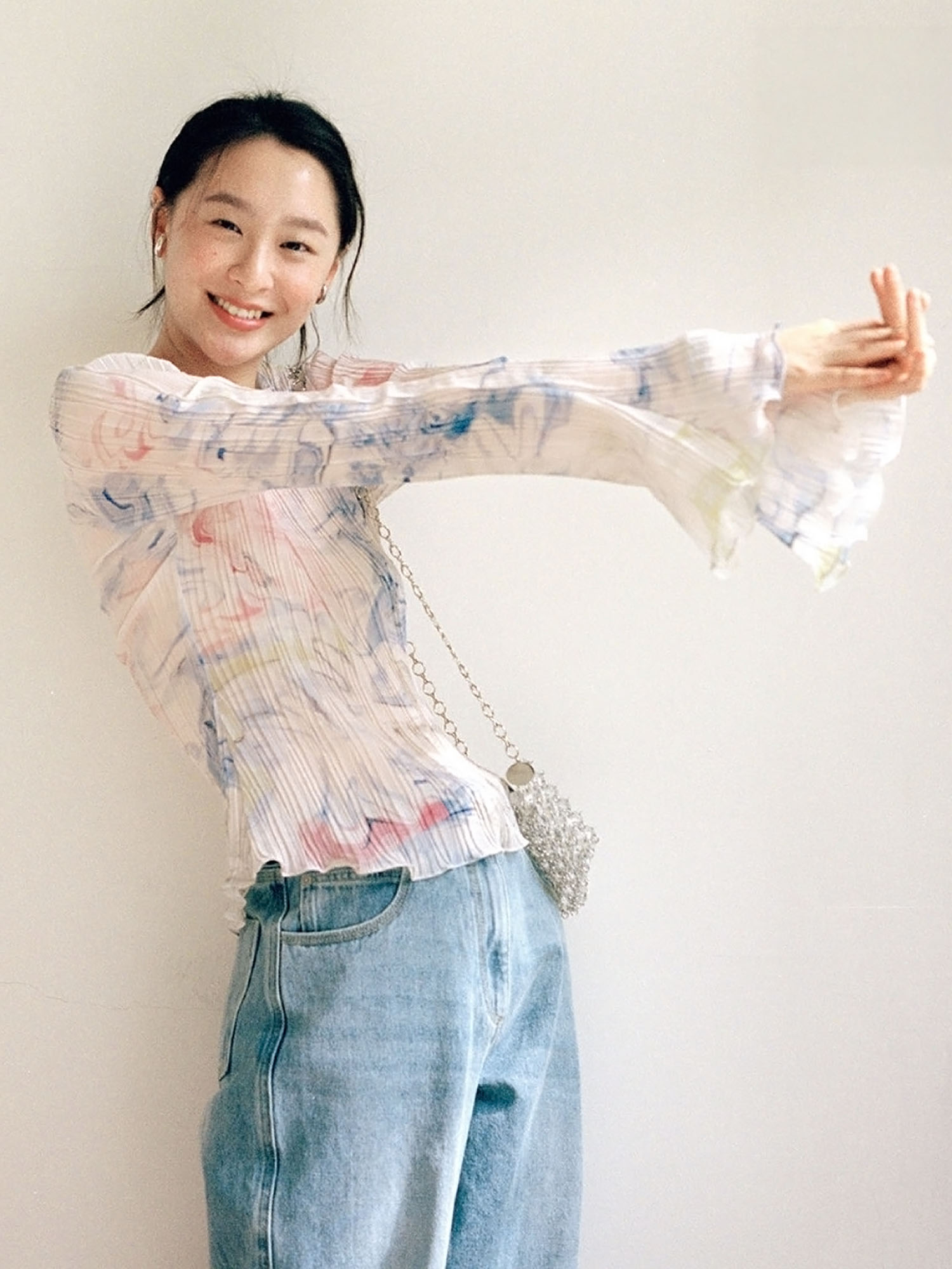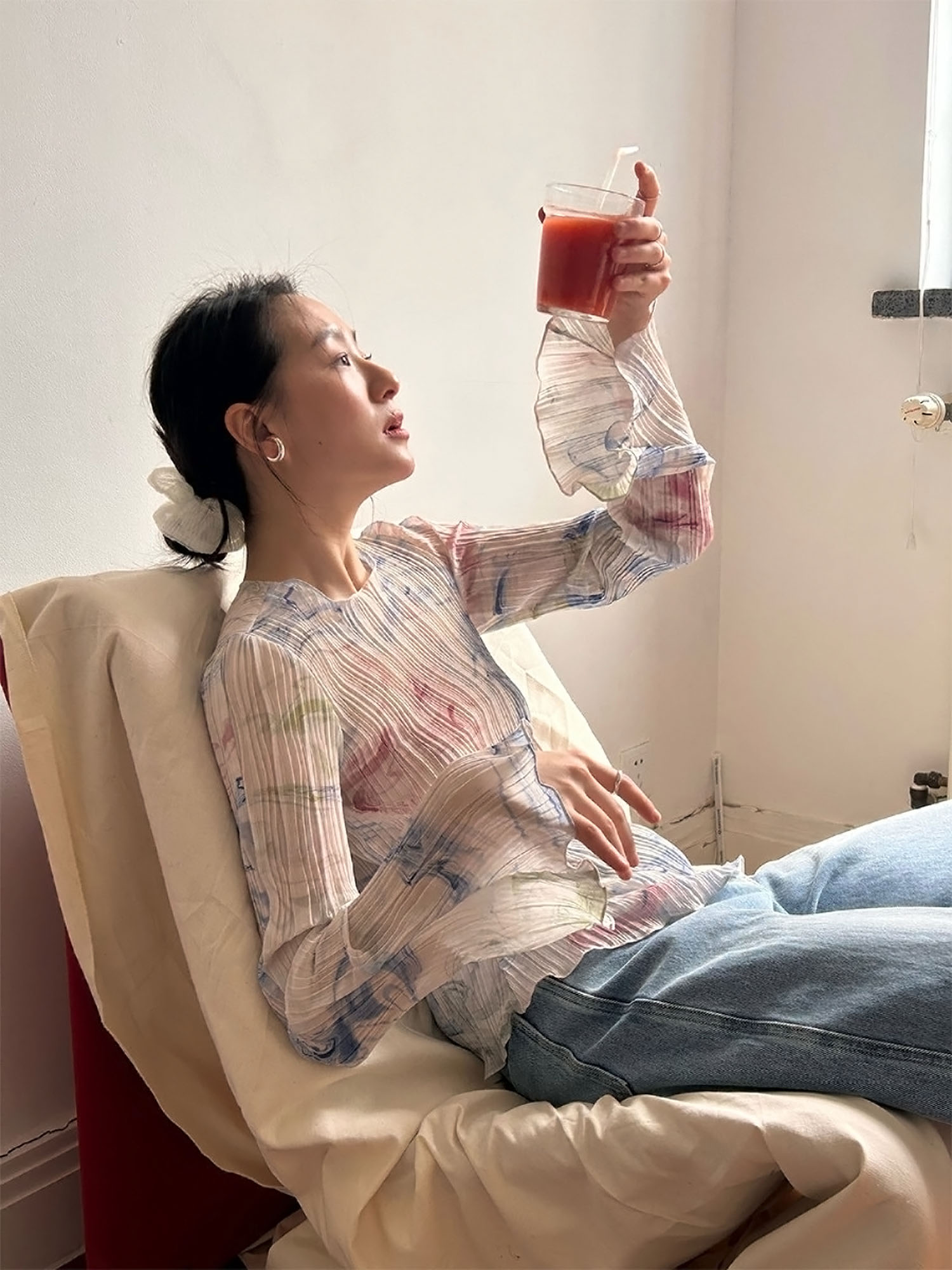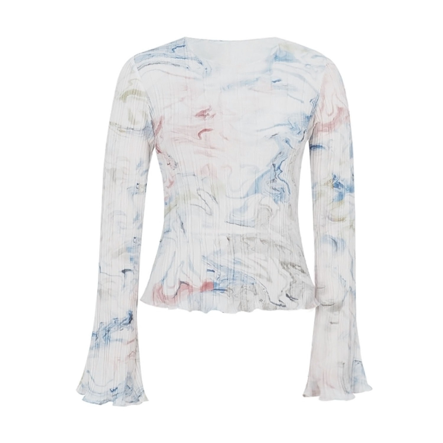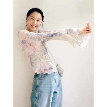 首页 > 长袖T恤 > BY15100# 复古温柔法式设计感压褶印染雪纺衫女上衣春夏 服裝批發女裝批發服飾貨源