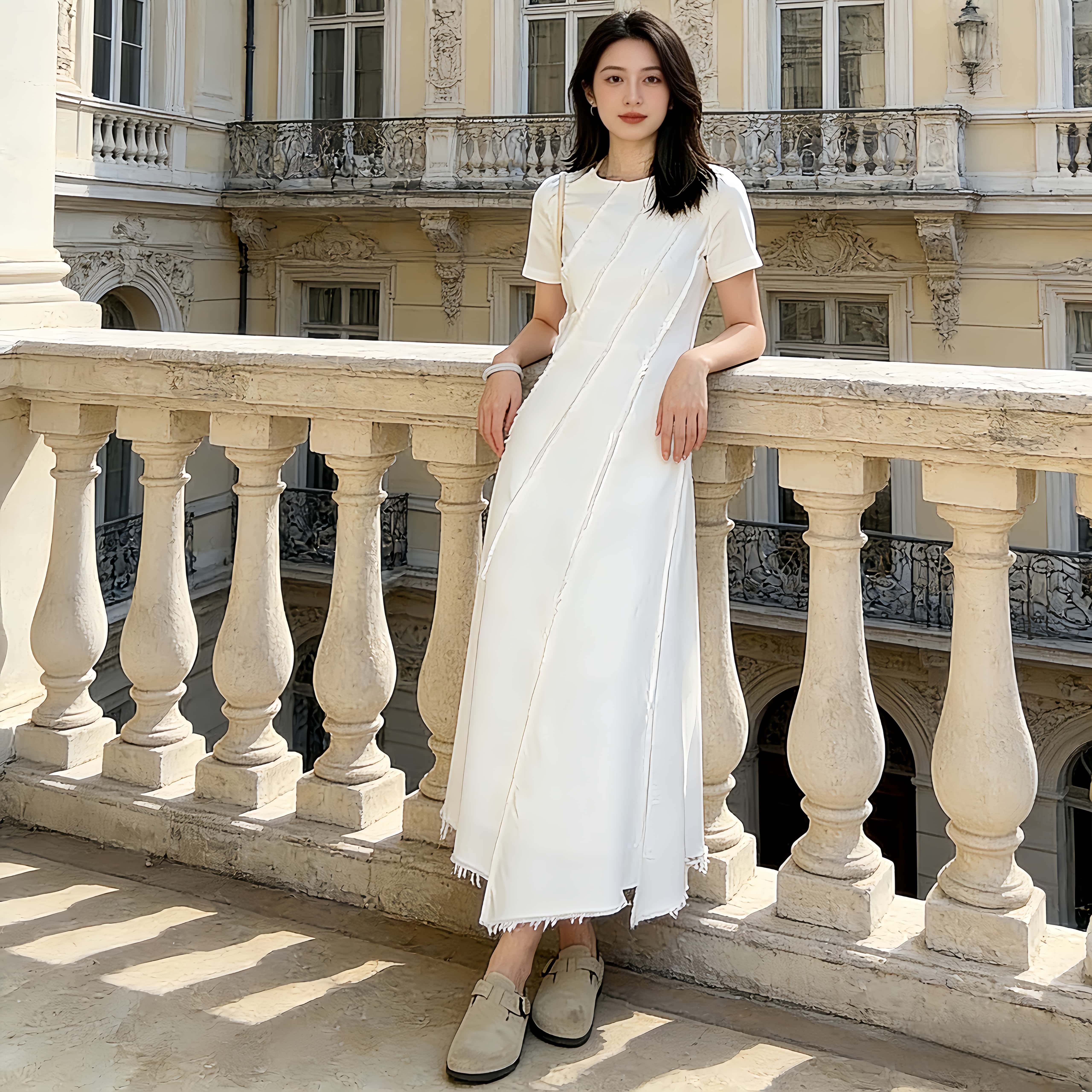 BY15168# 法式白色短袖气质连衣裙女简约收腰显瘦不规则拼接连衣裙 服裝批發女裝批發服飾貨源