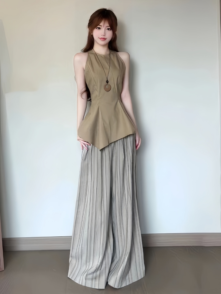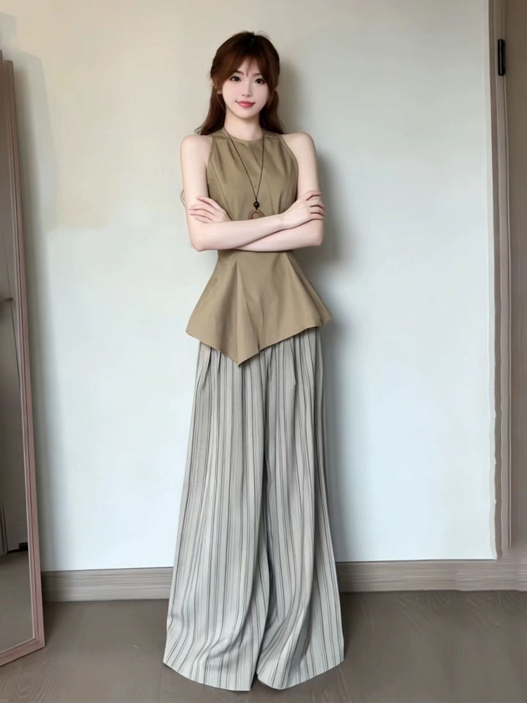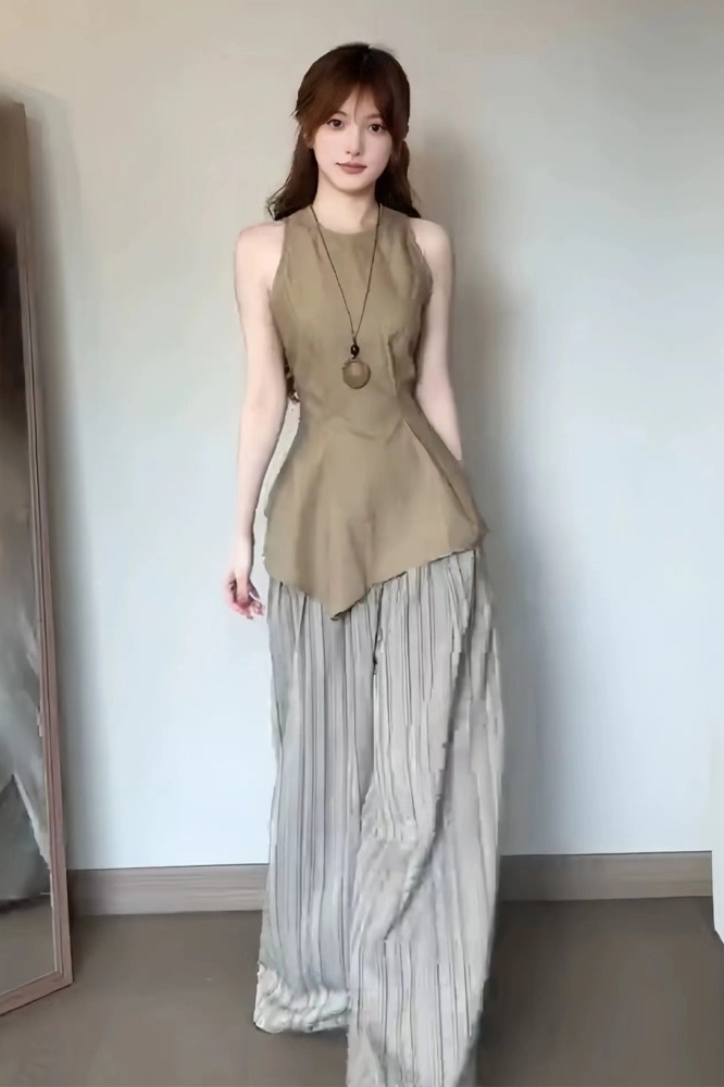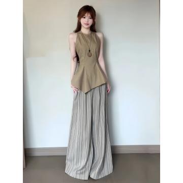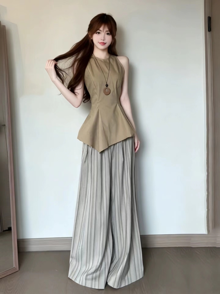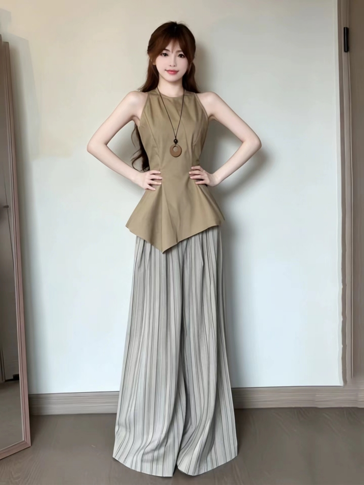 BY15802# 气质一整套ootd穿搭夏季新款通勤风卡其色无袖上衣阔腿裤两件套装 服裝批發女裝批發服飾貨源