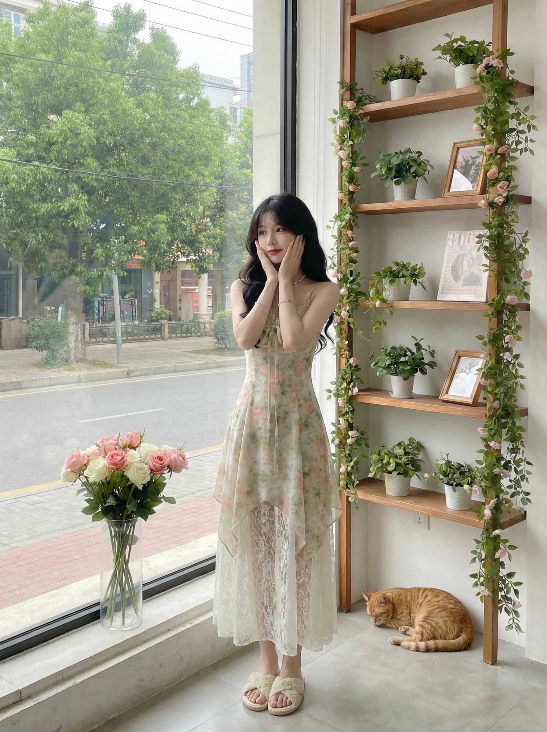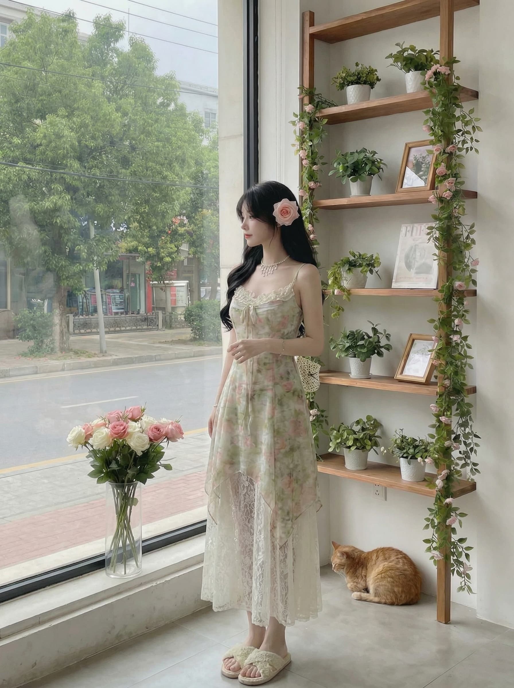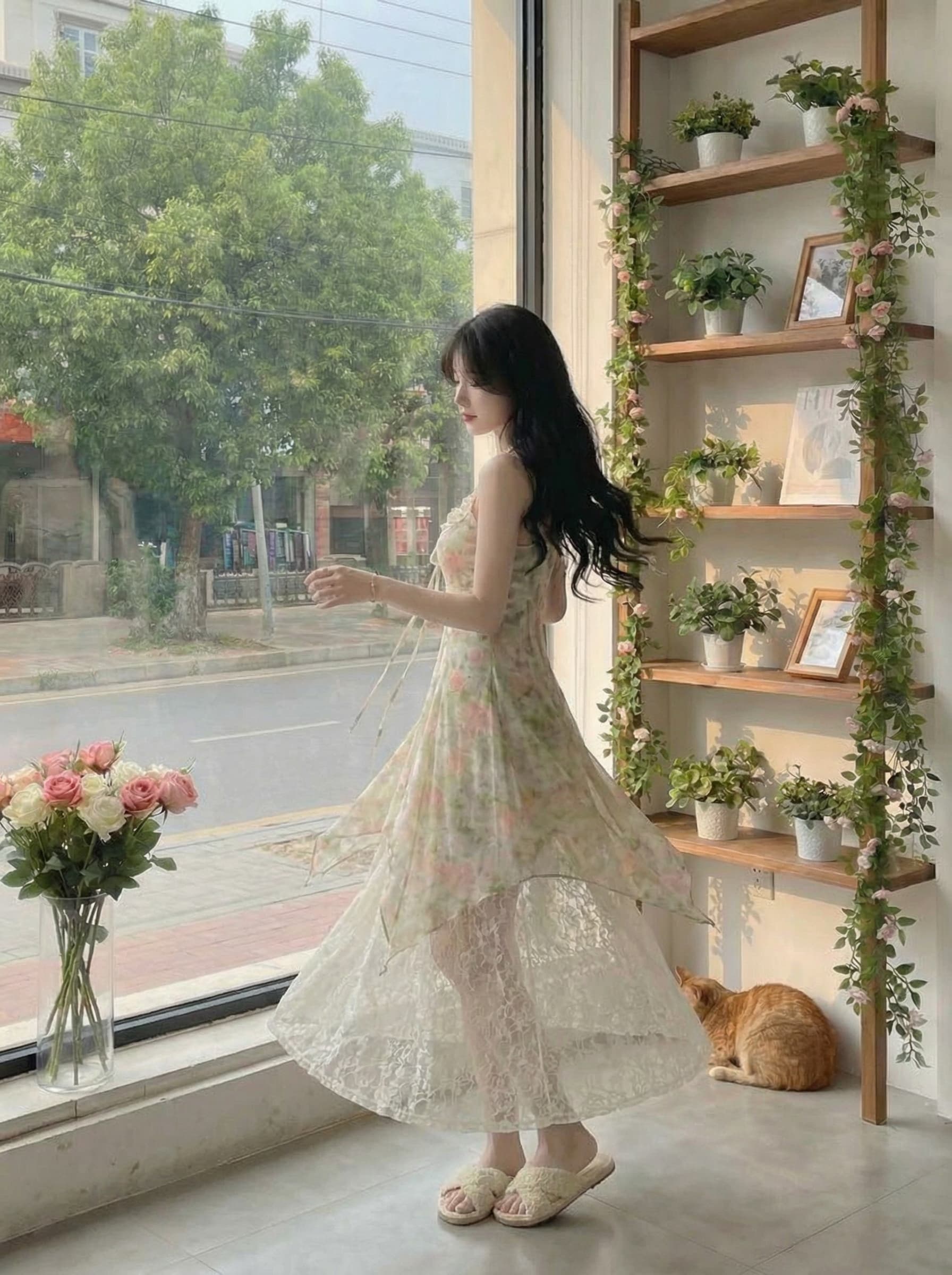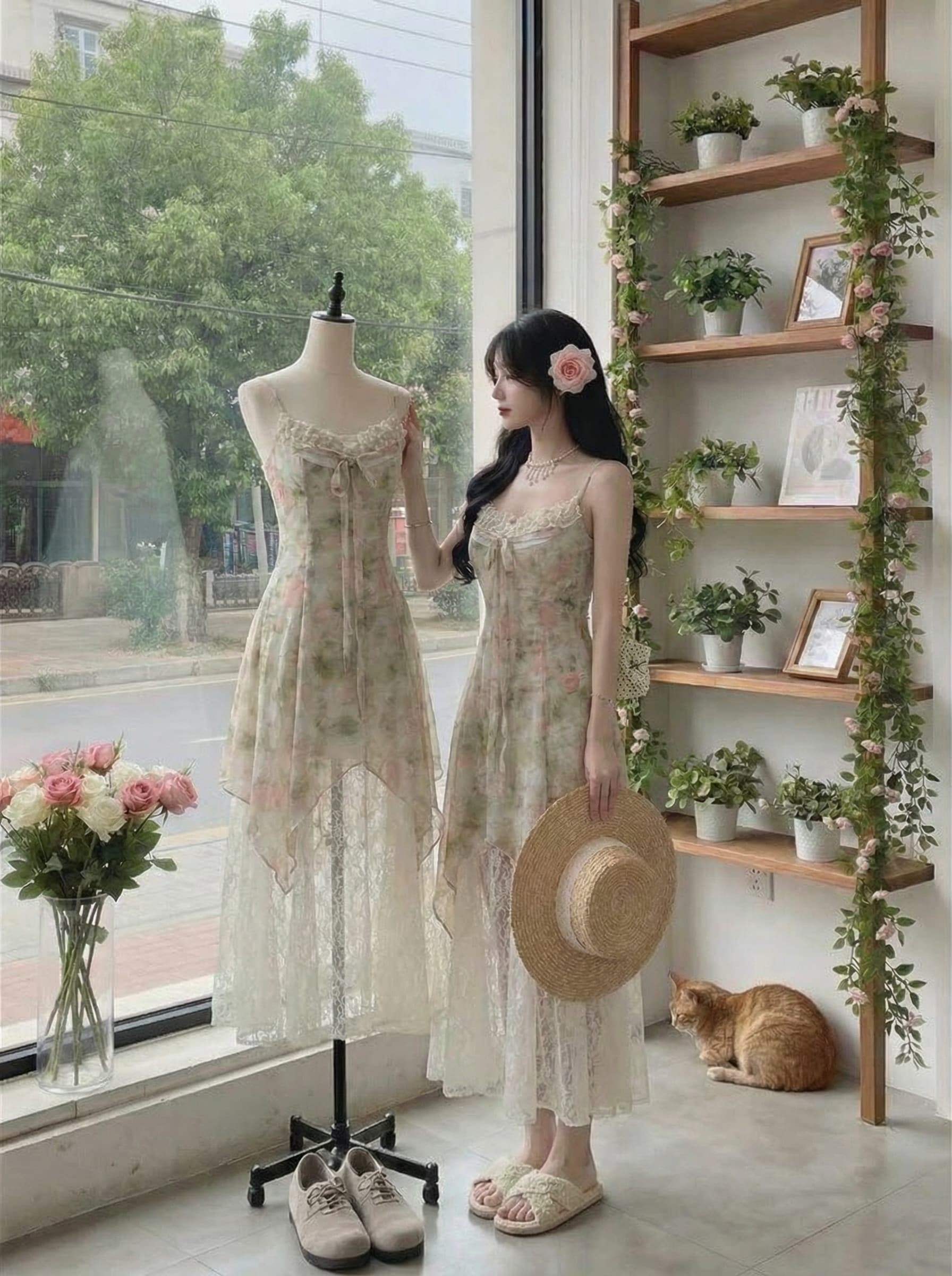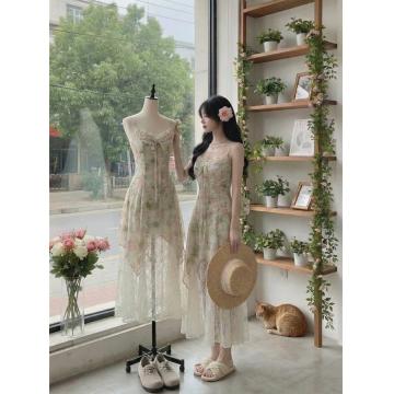 BY15881# Blovelan晨露花园甜美蝴蝶结飘带碎花蕾丝拼接层次感吊带连衣裙 服裝批發女裝批發服飾貨源