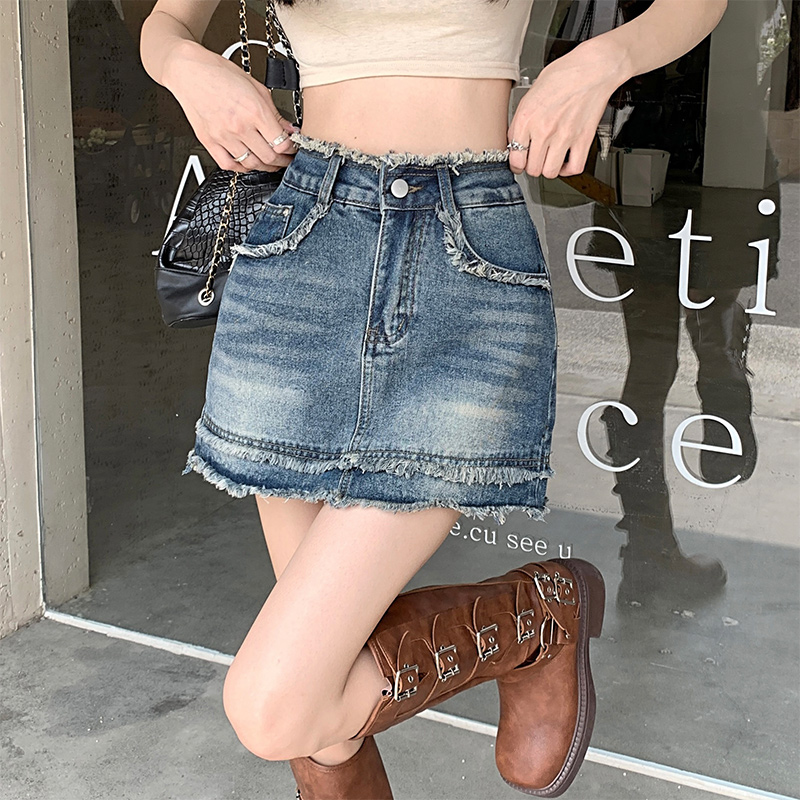 毛边半身牛仔裙女a字薄款小众设计感复古高腰辣妹ins风包臀短裙子 服裝批發女裝批發服飾貨源
