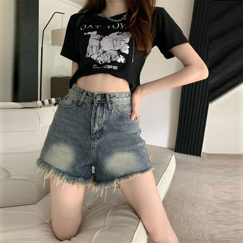 流苏毛边高腰牛仔短裤女复古夏季新款宽松大码显瘦阔腿A字热裤子 服裝批發女裝批發服飾貨源