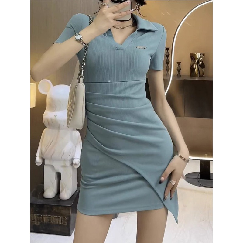 辣妹纯欲风不规则连衣裙女夏季小个子POLO领收腰显瘦短袖包臀裙潮 服裝批發女裝批發服飾貨源