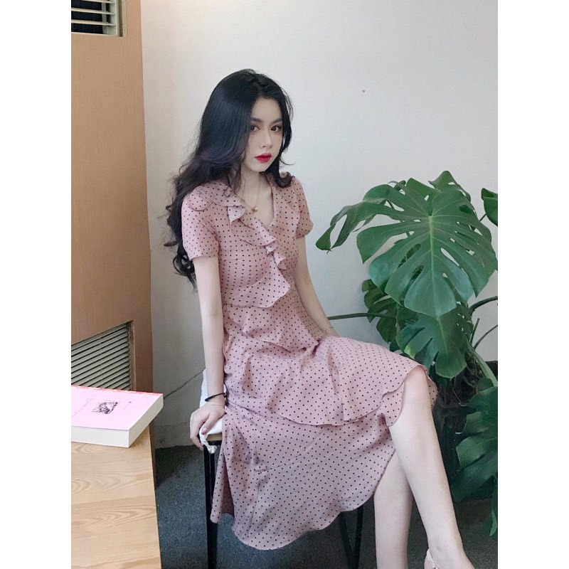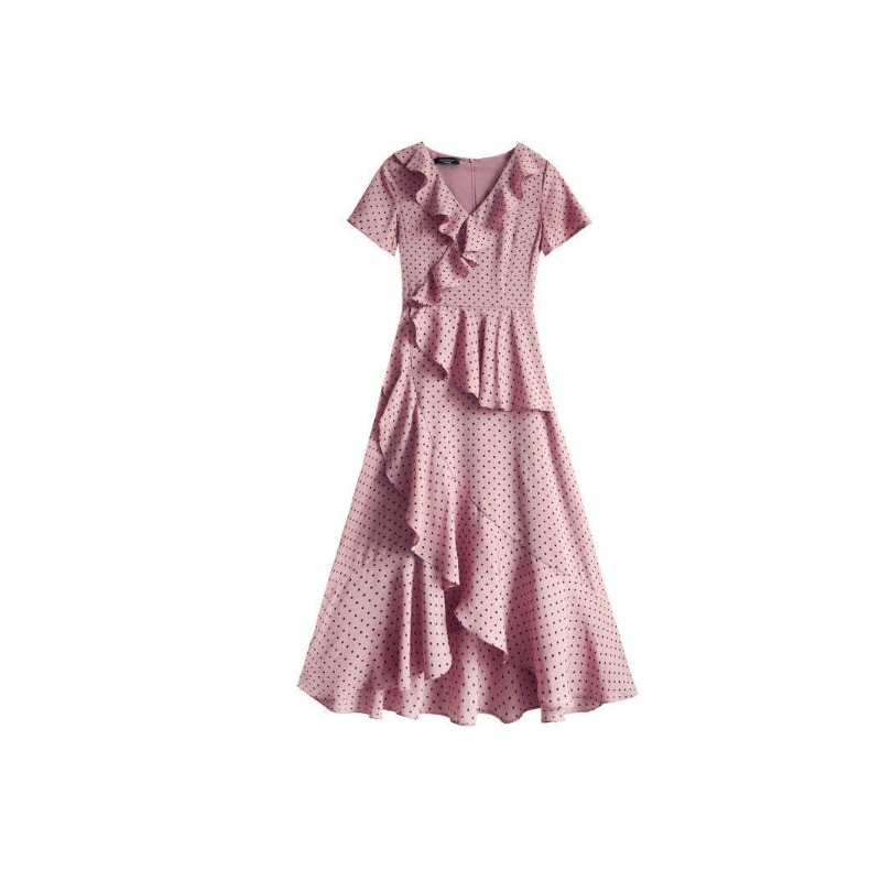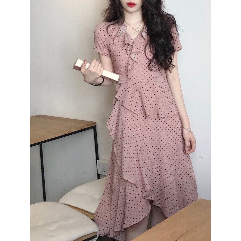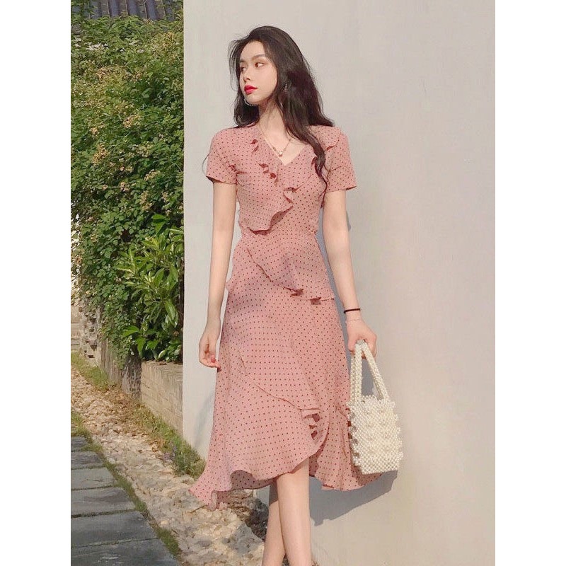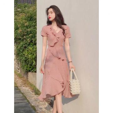 纯欲雪纺裙子法式复古裹身裙夏新款文艺v领浪漫荷叶边连衣裙 服裝批發女裝批發服飾貨源