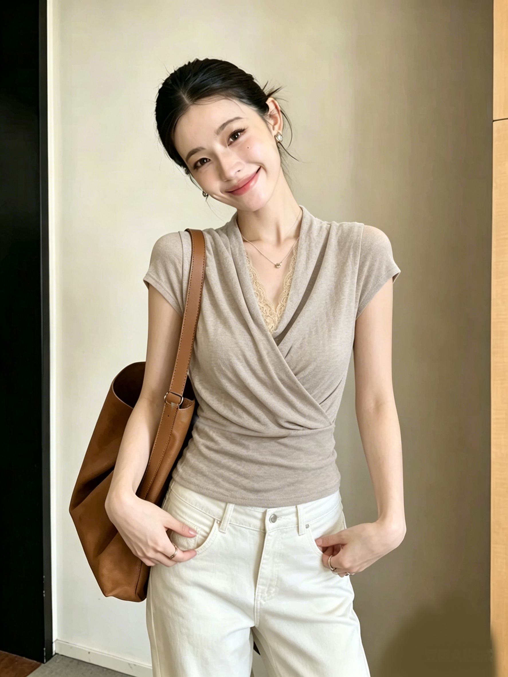 BY17577# 十三行春夏新款浪漫花蕾丝拼接v领交叉收褶小衫 服裝批發女裝批發服飾貨源