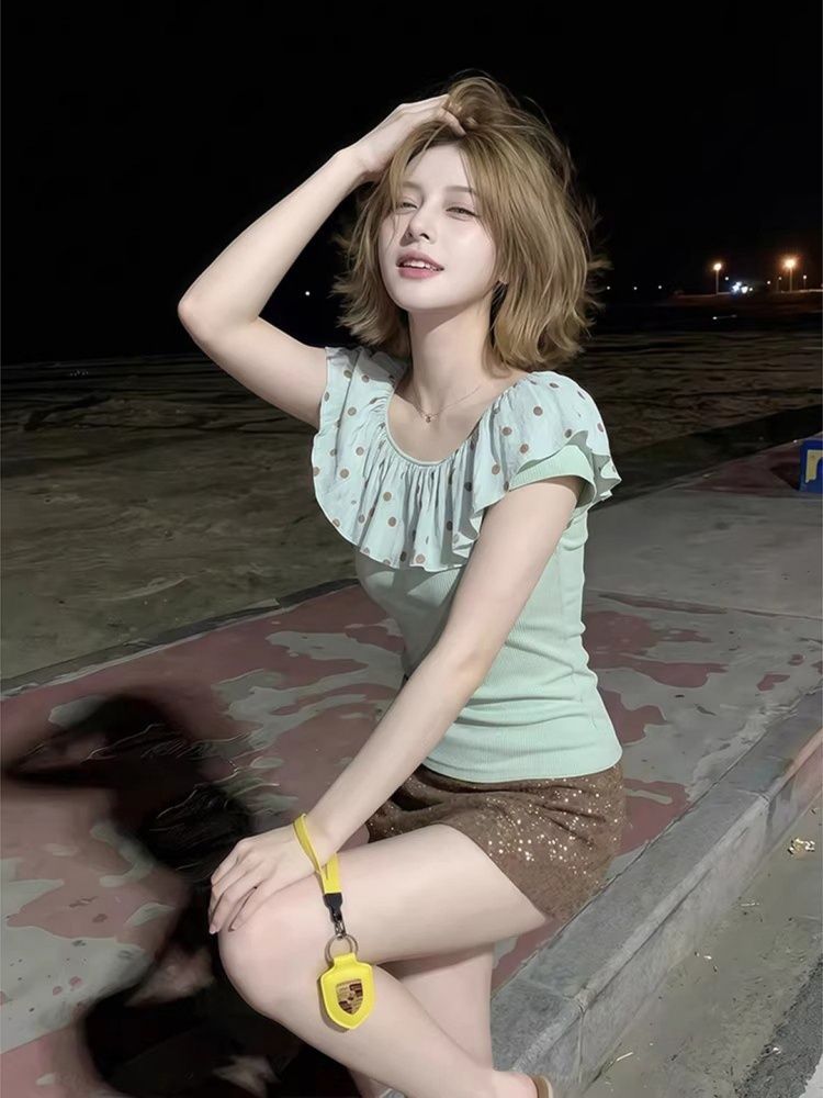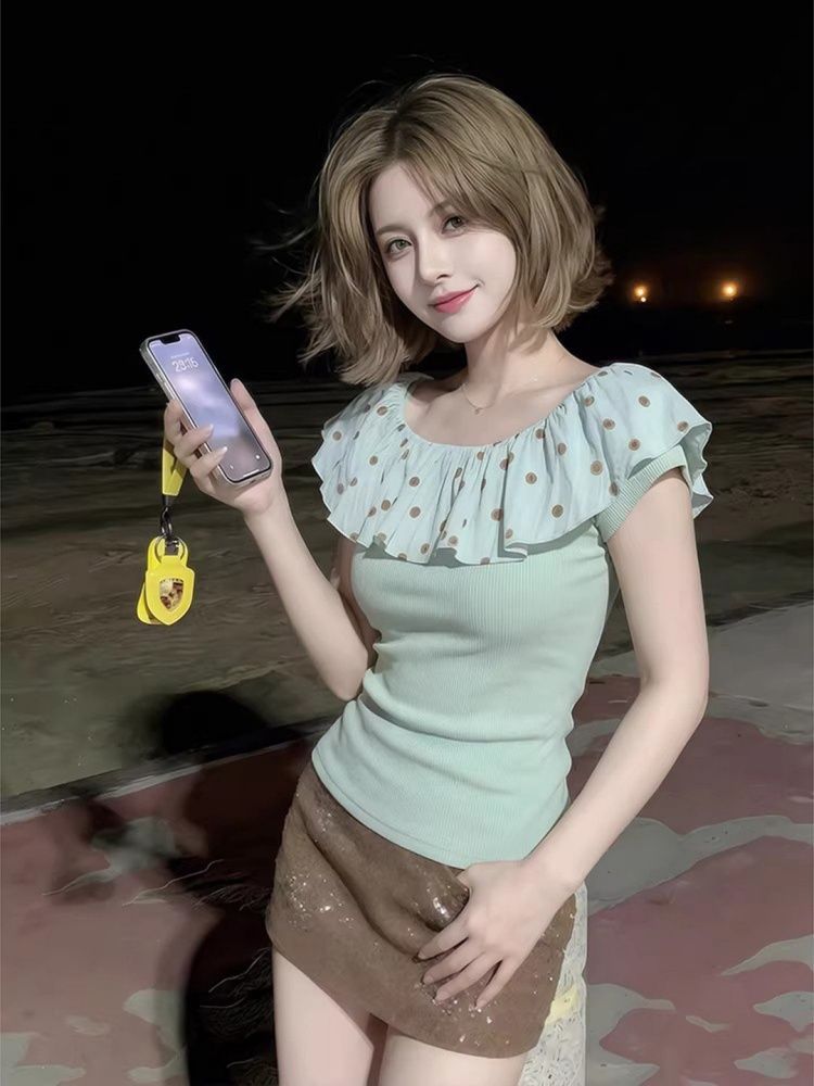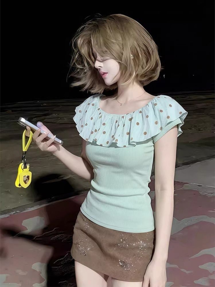 BY17588# 法式气质波点荷叶边一字肩T恤女夏清新褶皱掐腰修身短款上衣 服裝批發女裝批發服飾貨源