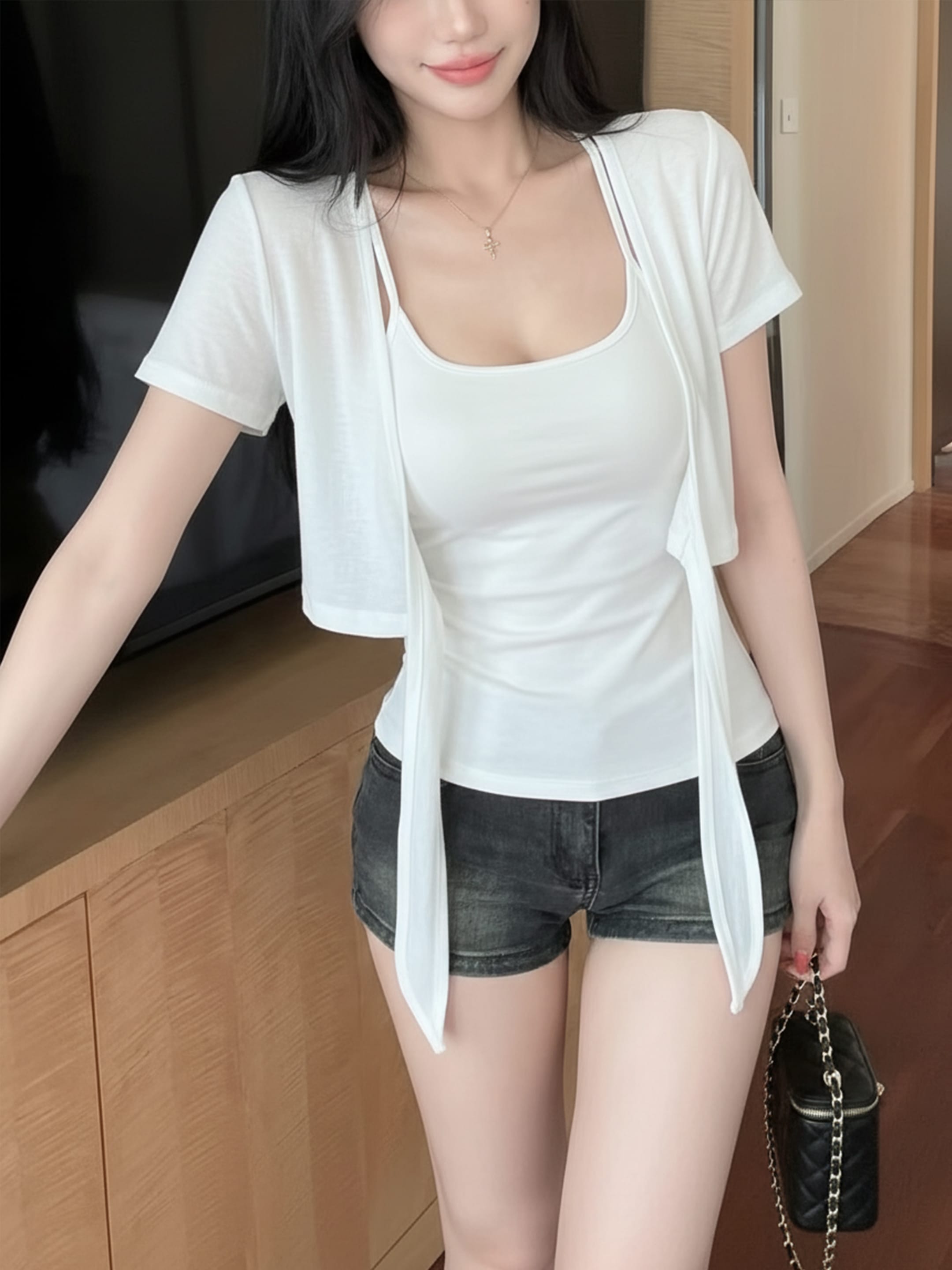 BY18002# 设计感绑带短袖开衫加弹力胸垫吊带背心两件套装女 服裝批發女裝批發服飾貨源