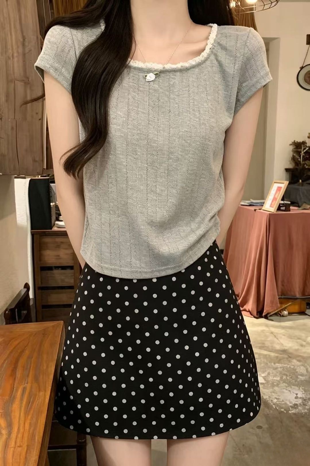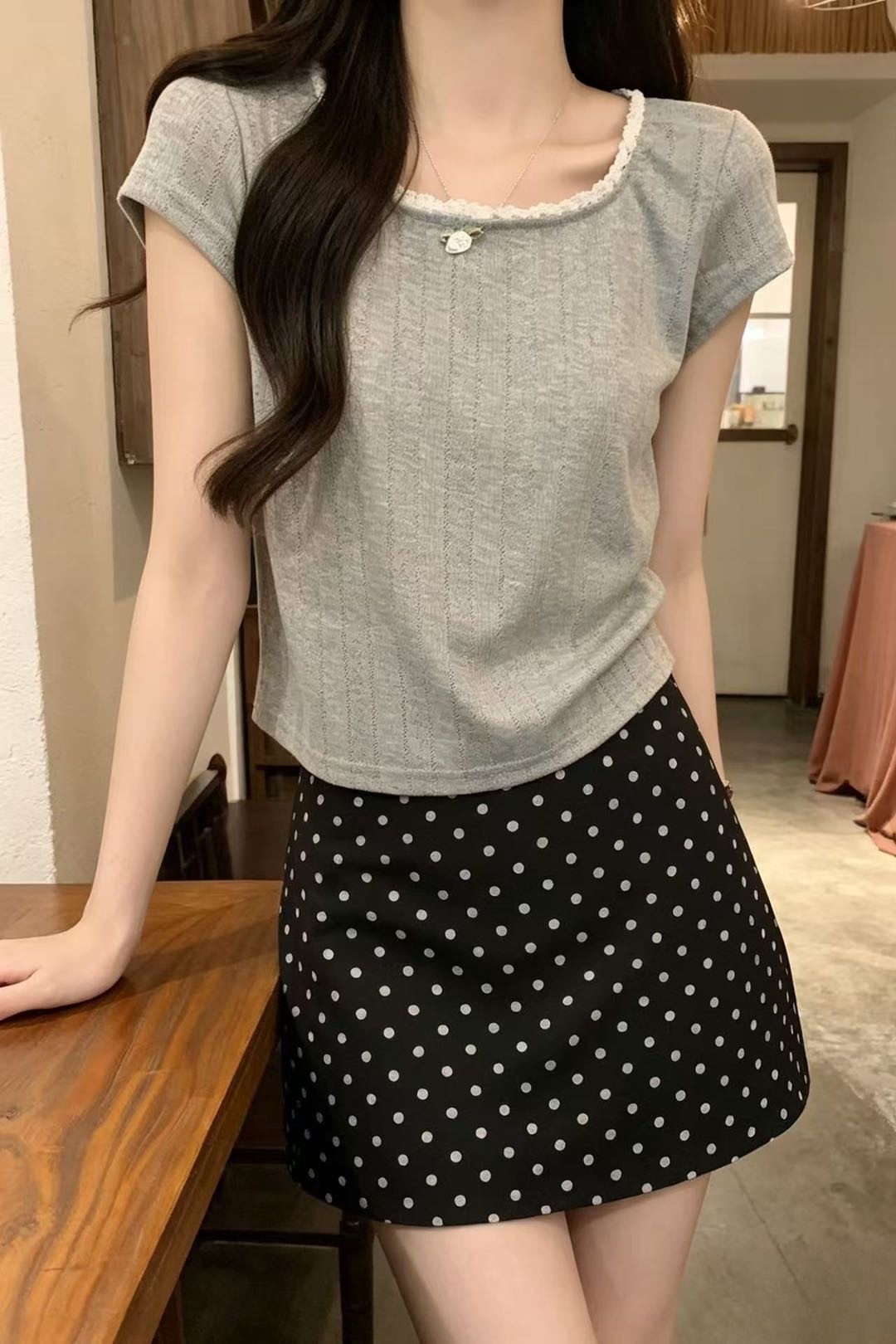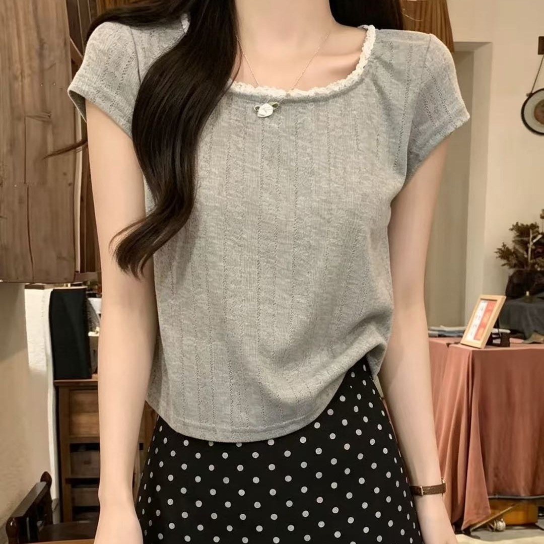 BY18035# 蕾丝花边立体小花短袖T恤女夏季新款高腰短款方领小衫上衣潮 服裝批發女裝批發服飾貨源