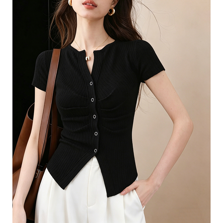 BY18047# 莱赛尔褶皱修身短袖夏季新款韩系V领收腰小众别致上衣 服裝批發女裝批發服飾貨源