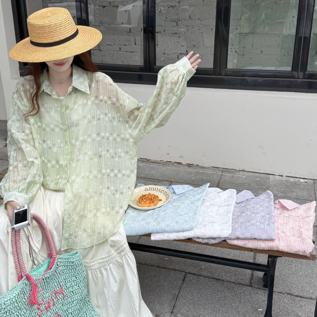 BY18085# 韩版夏季透视装提花衬衫大码宽松时尚设计感百搭防晒衣外套女衬衣 服裝批發女裝批發服飾貨源