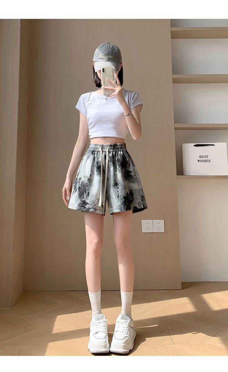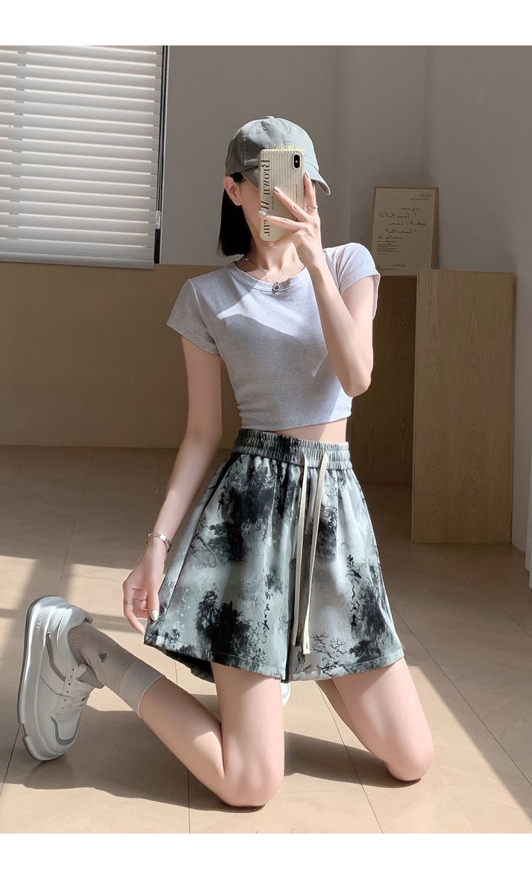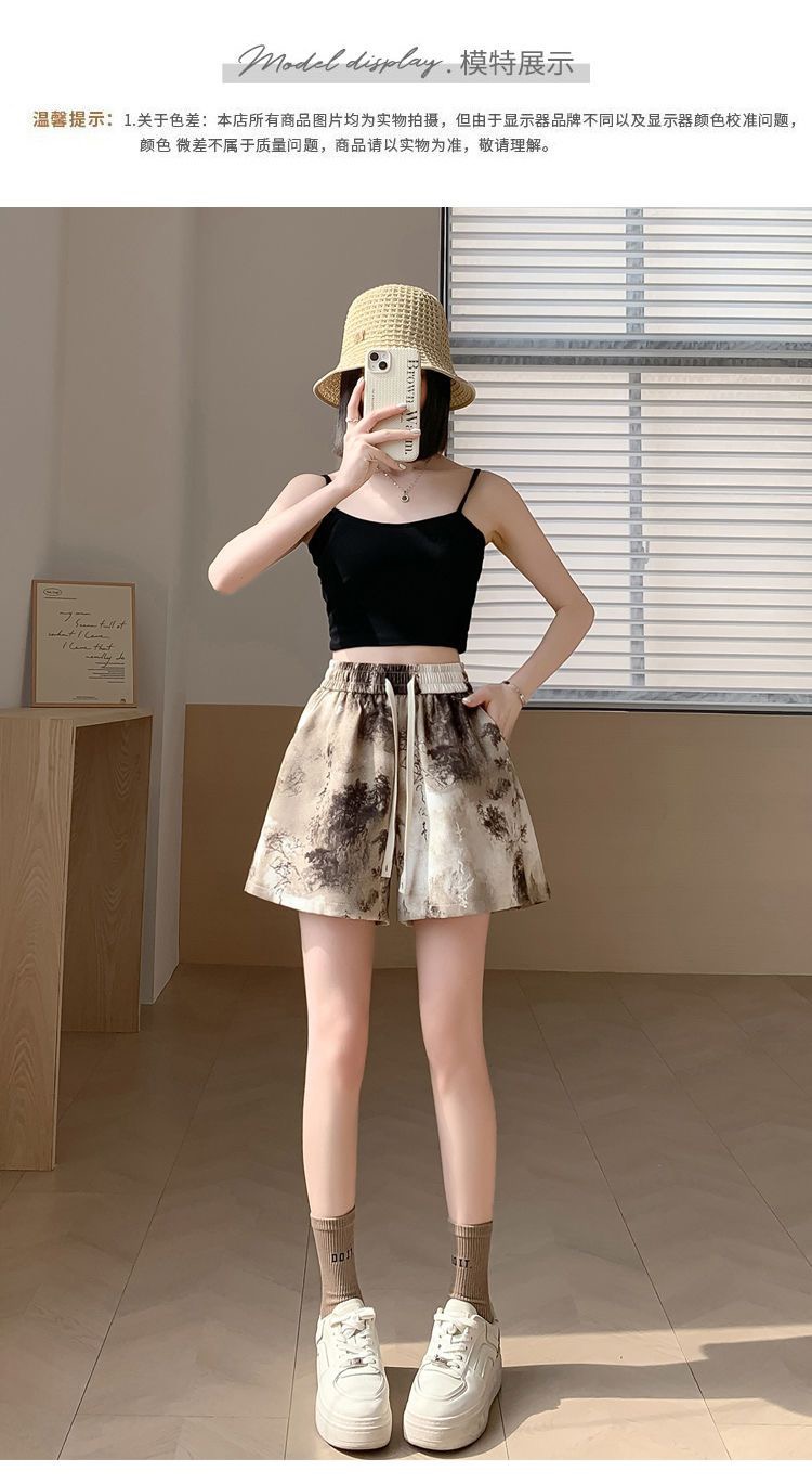 BY18256# 冰丝速干短裤女新中式水墨印花阔腿裤女夏国风短裤宽松直筒休闲裤 服裝批發女裝批發服飾貨源
