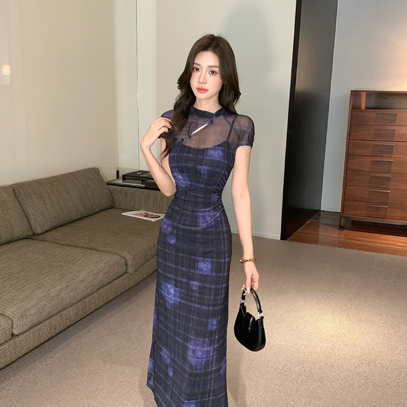 BY18349# 26新中式改良旗袍连衣裙女夏复古镂空网纱印花收腰长裙 服裝批發女裝批發服飾貨源