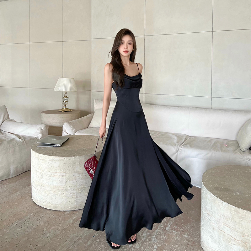 BY18350# 夏季冷香黑茶裙法式气质荡领收腰修身开叉缎面吊带连衣裙 服裝批發女裝批發服飾貨源
