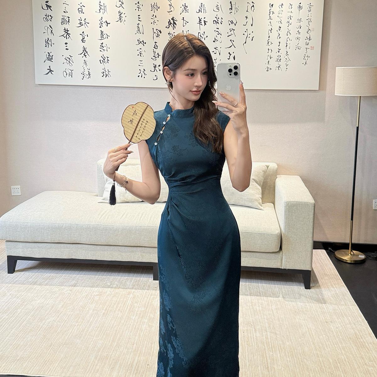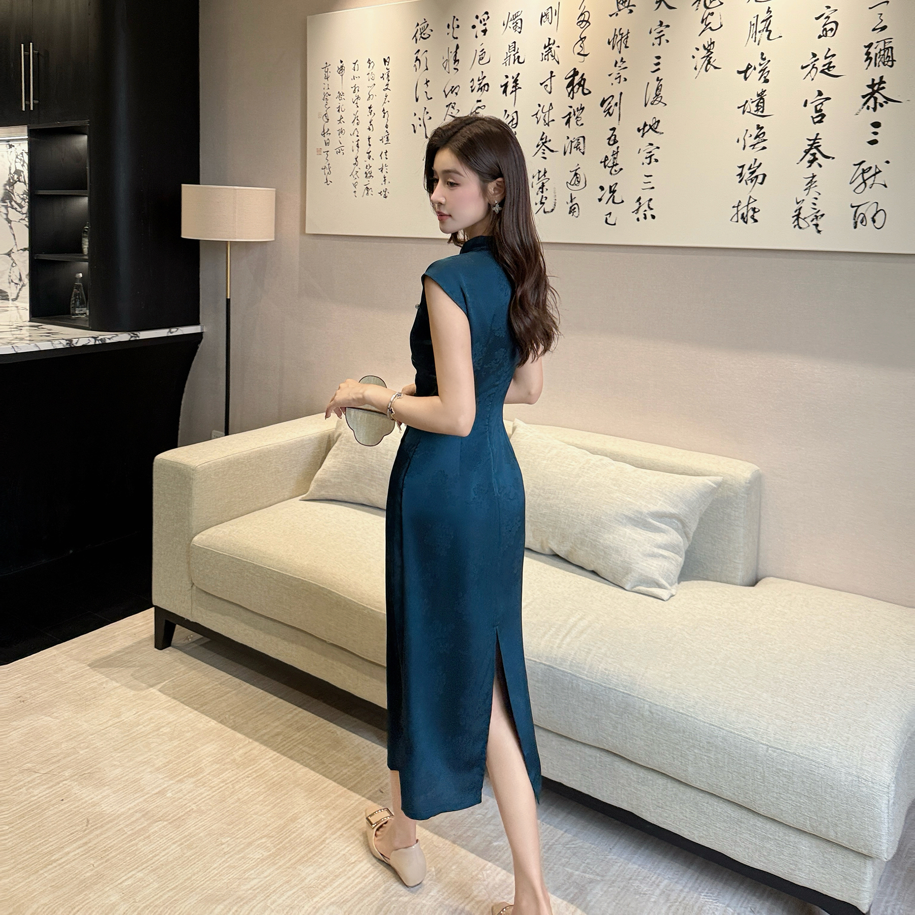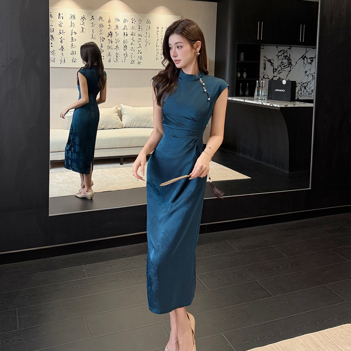 BY18352# 新中式气质镂空设计缎面提花改良旗袍显瘦显白连衣裙长裙女 服裝批發女裝批發服飾貨源