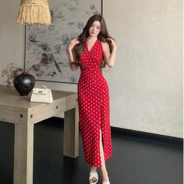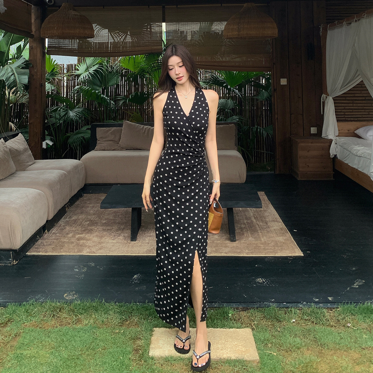 BY18355# 夏季新款百搭法式V领收腰长裙修身波点连衣裙开叉显瘦气质长裙女 服裝批發女裝批發服飾貨源