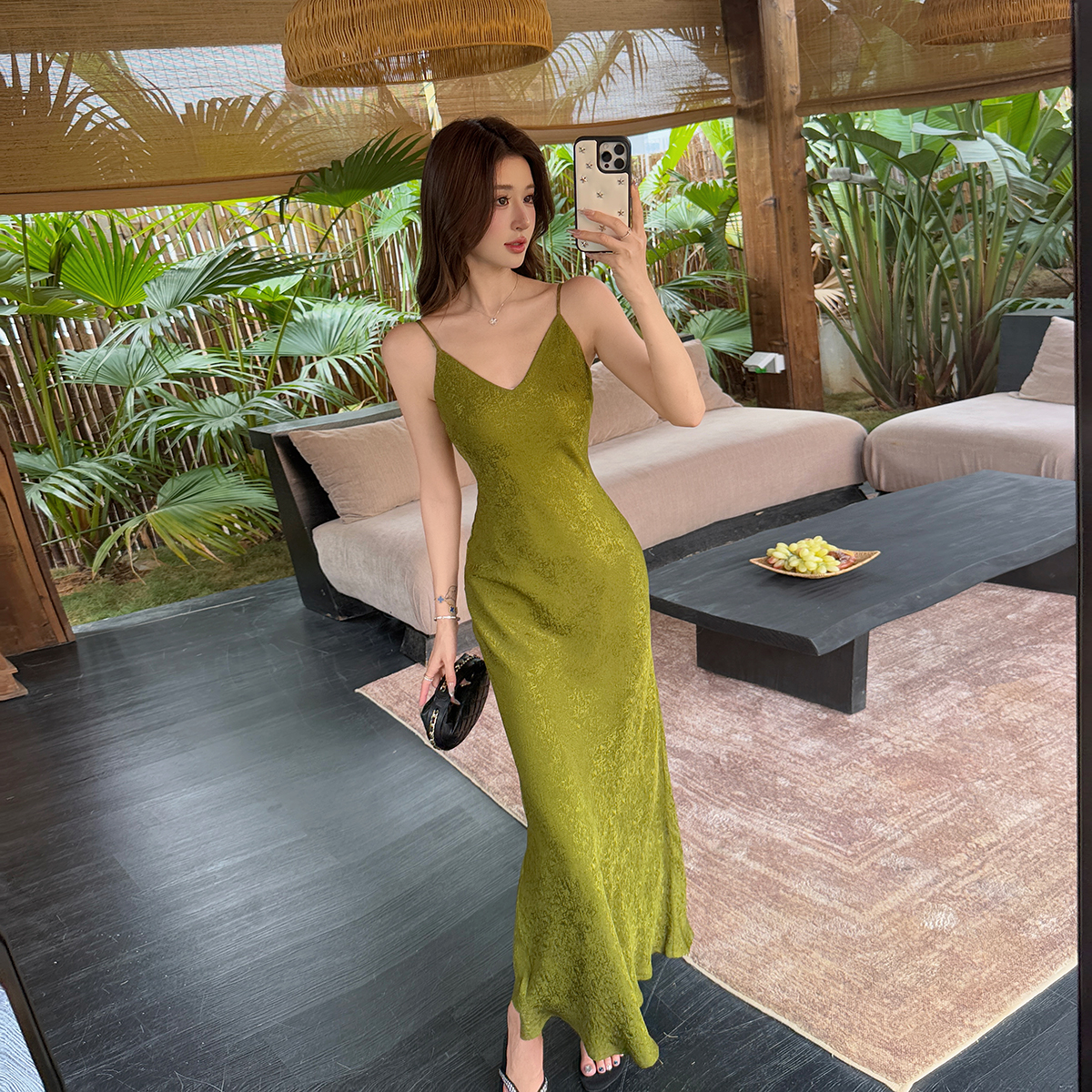 BY18356# 山野入春法式复古45°斜裁连衣裙暗纹提花V领吊带裙 服裝批發女裝批發服飾貨源