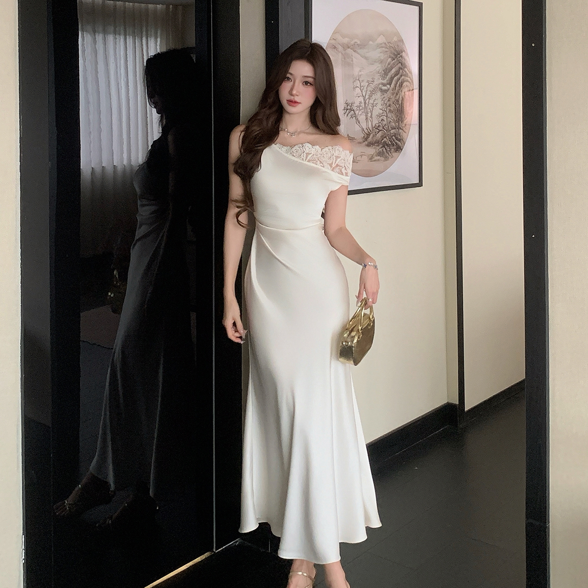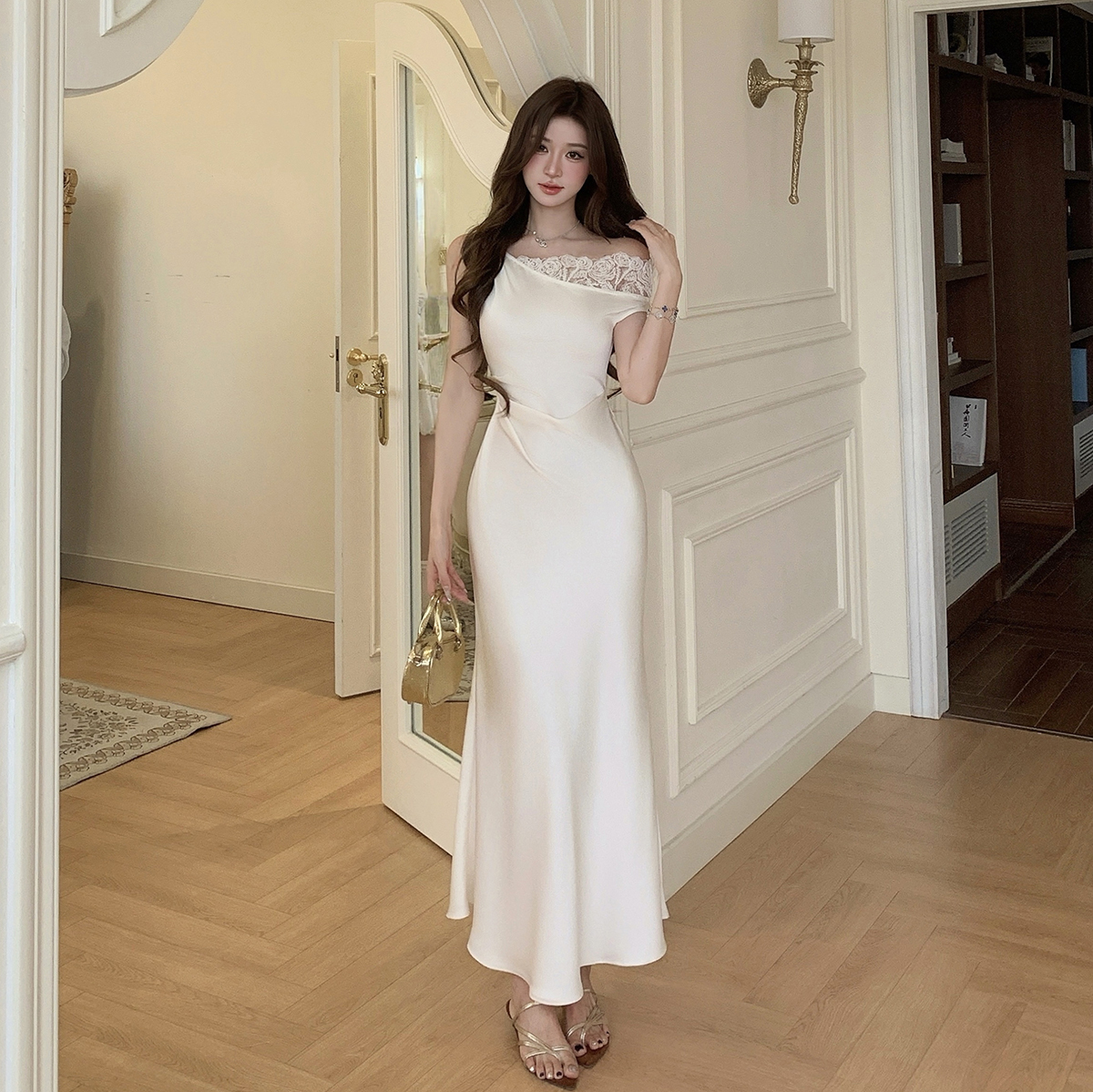 BY18357# 戛纳月光白色缎面轻礼服修身收腰斜肩扭结无袖连衣裙夏装女 服裝批發女裝批發服飾貨源