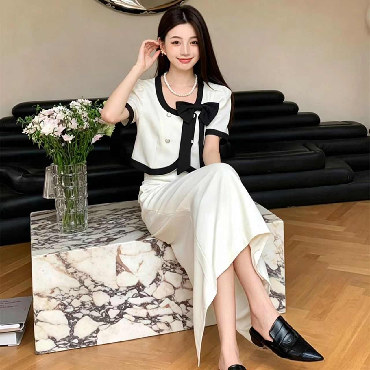 BY19362# 夏季新款法式小香风黑白撞色蝴蝶结套装高智感简约高级两件套 服裝批發女裝批發服飾貨源